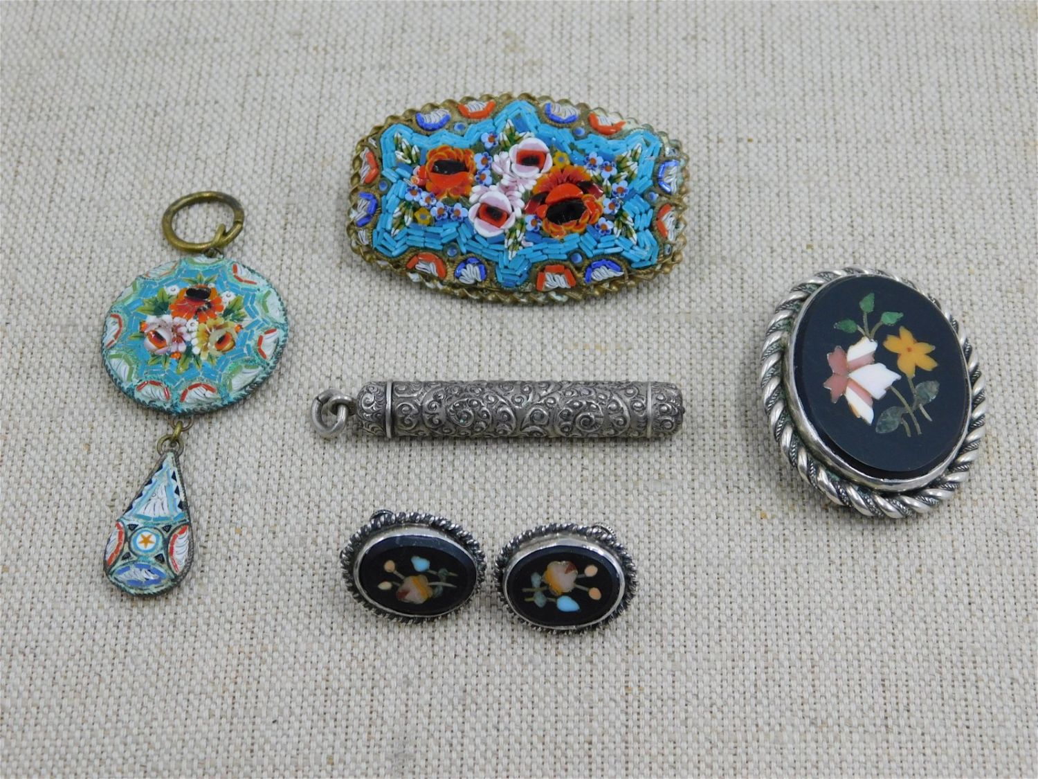 Petra Duro Micro Mosaic Sterling Lot including Pencil for Chatelaine measuring 2" – inner working seized, JC Michels Pin and Screwback Earrings, and 2 Micro Mosaic Pins marked Made in Italy measuring between 2-3" – Slight corrosion seeping into mosaic. All invoices must be paid within 24 hours of the sale. All items are shipped USPS or UPS and will be billed separately. A $12 handling fee is added to the shipping price per lot if shipped in house. Some items or large quantity of purchases will be packed and shipped via the Monmouth Junction UPS store. Local pickups are at our Monmouth Junction location on Friday, Saturday and Monday ONLY! All pickups are by appointment only. Any condition issues will be listed in the description. Please read the terms for full information.
