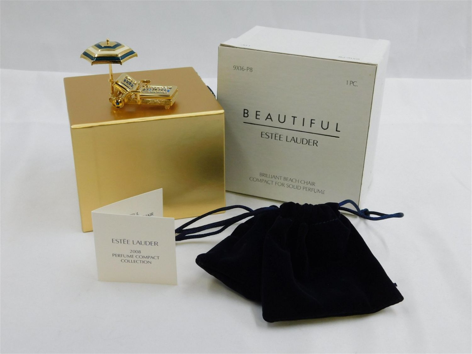Beautiful by Estee Lauder Brilliant Beach Chair Compact for Solid Perfume – Designed for Estee Lauder – 2008. Enamel and Rhinestones. Umbrella comes apart from beach chair. Measures 1.75" tall x 2.5" wide. New in Box. Comes in original box, outer box, bag and paperwork. All invoices must be paid within 24 hours of the sale. All items are shipped USPS or UPS and will be billed separately. A $12 handling fee is added to the shipping price per lot if shipped in house. Some items or large quantity of purchases will be packed and shipped via the Monmouth Junction UPS store. Local pickups are at our Monmouth Junction location on Friday, Saturday and Monday ONLY! All pickups are by appointment only. Any condition issues will be listed in the description. Please read the terms for full information.