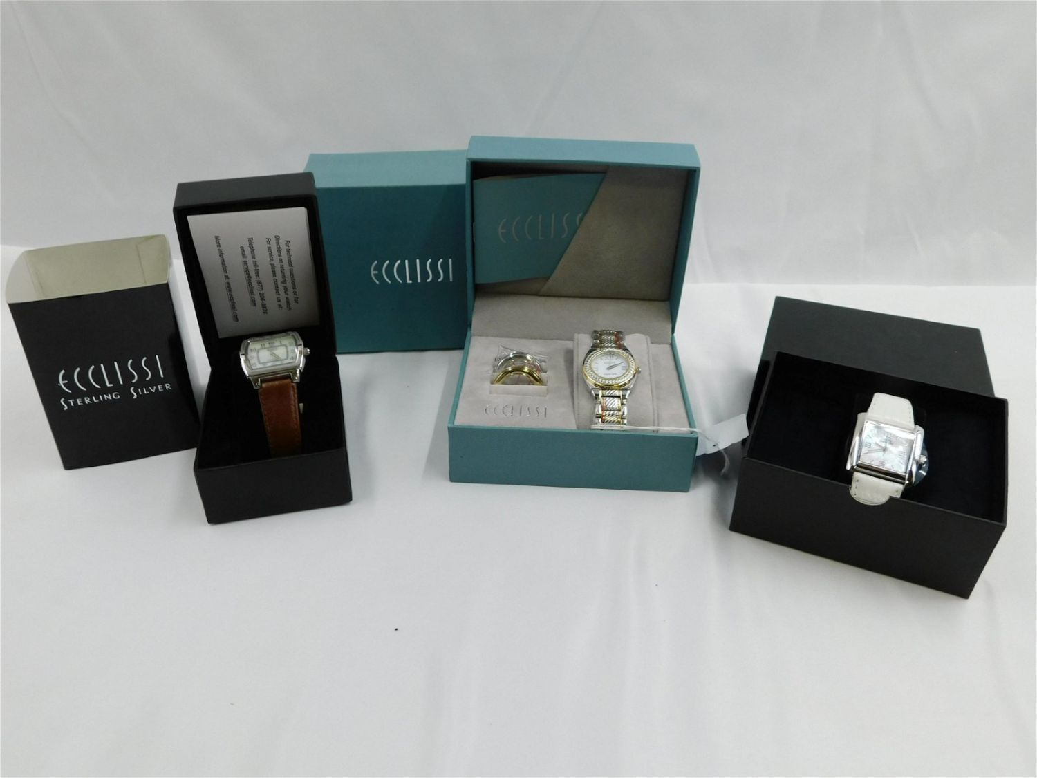 Lot of 3 Sterling Silver Watches including 2 by Ecclissi and 1 by Signatures. All watches the Cases are Sterling and backs are Stainless Steel. All come in original packaging. All invoices must be paid within 24 hours of the sale. All items are shipped USPS or UPS and will be billed separately. A $12 handling fee is added to the shipping price per lot if shipped in house. Some items or large quantity of purchases will be packed and shipped via the Monmouth Junction UPS store. Local pickups are at our Monmouth Junction location on Friday, Saturday and Monday ONLY! All pickups are by appointment only. Any condition issues will be listed in the description. Please read the terms for full information.
