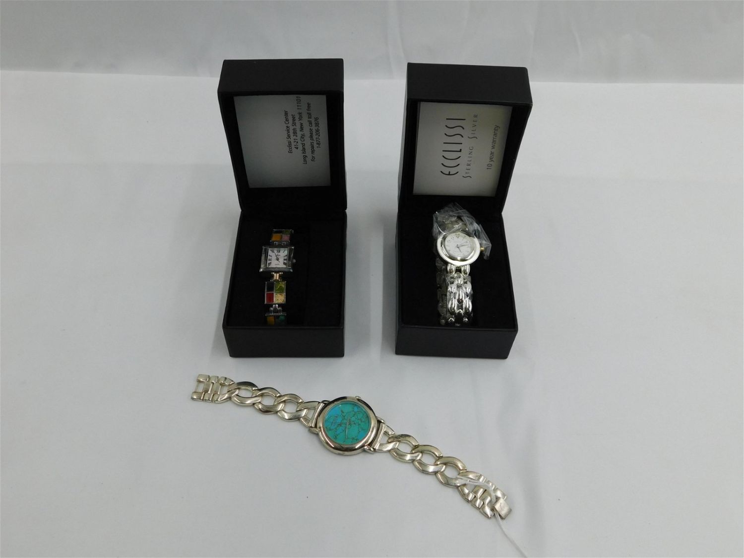 Lot of 3 Sterling Silver Ecclissi Watches. Measures 7". Two come in original boxes. All invoices must be paid within 24 hours of the sale. All items are shipped USPS or UPS and will be billed separately. A $12 handling fee is added to the shipping price per lot if shipped in house. Some items or large quantity of purchases will be packed and shipped via the Monmouth Junction UPS store. Local pickups are at our Monmouth Junction location on Friday, Saturday and Monday ONLY! All pickups are by appointment only. Any condition issues will be listed in the description. Please read the terms for full information.