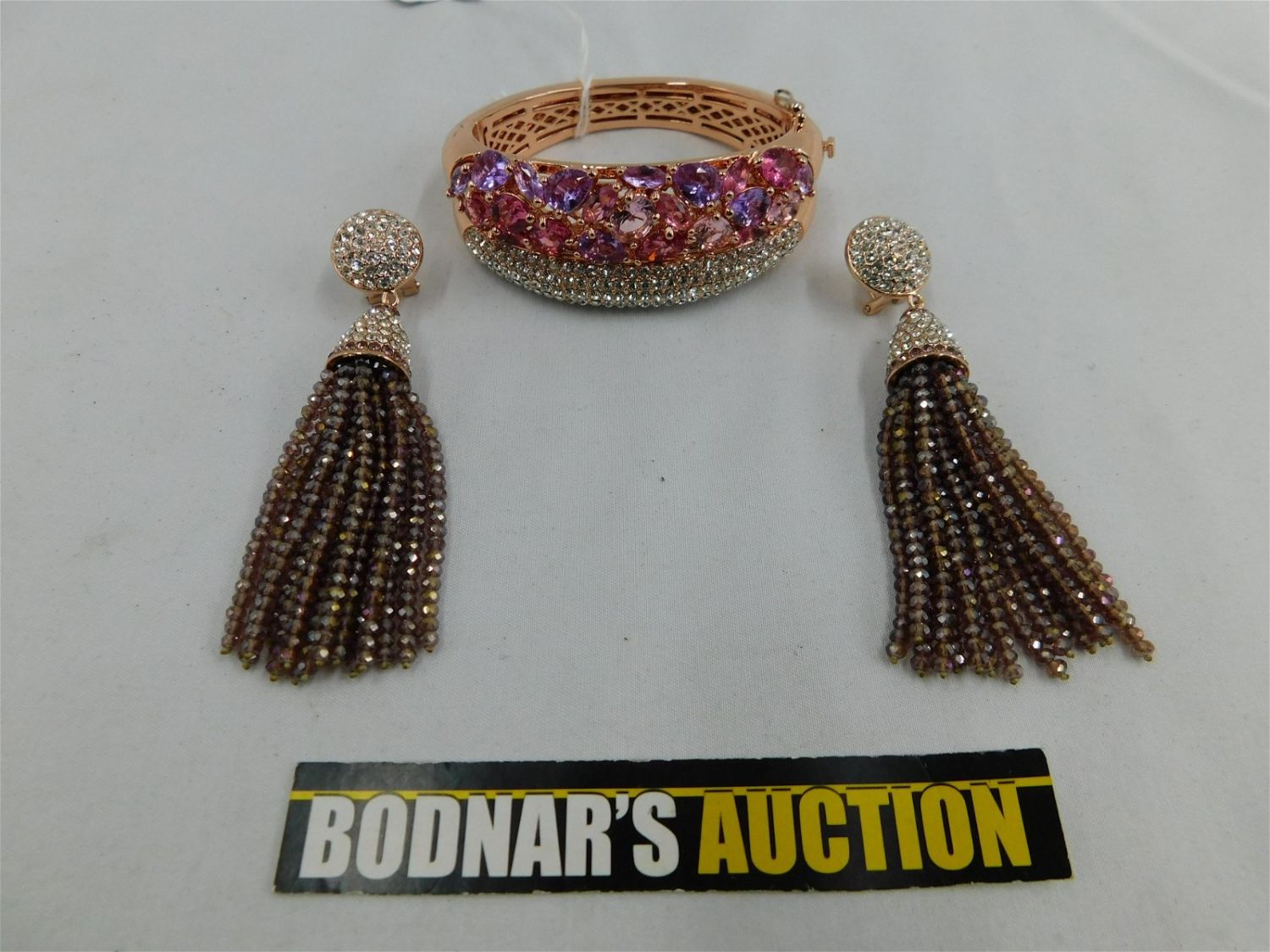 2 Joan Boyce pieces including a rose gold tone and pink/purple crystal hinged bangle bracelet and Joan Bouce purple crystal drop tassel earrings. The bracelet has 2 safety clasps an measures approx. 2 3/4" across and the earrings are pierced and measure approx. 3 1/4" long. All invoices must be paid within 24 hours of the sale. All items are shipped USPS or UPS and will be billed separately. A $12 handling fee is added to the shipping price per lot if shipped in house. Some items or large quantity of purchases will be packed and shipped via the Monmouth Junction UPS store. Local pickups are at our Monmouth Junction location on Friday, Saturday and Monday ONLY! All pickups are by appointment only. Any condition issues will be listed in the description. Please read the terms for full information.