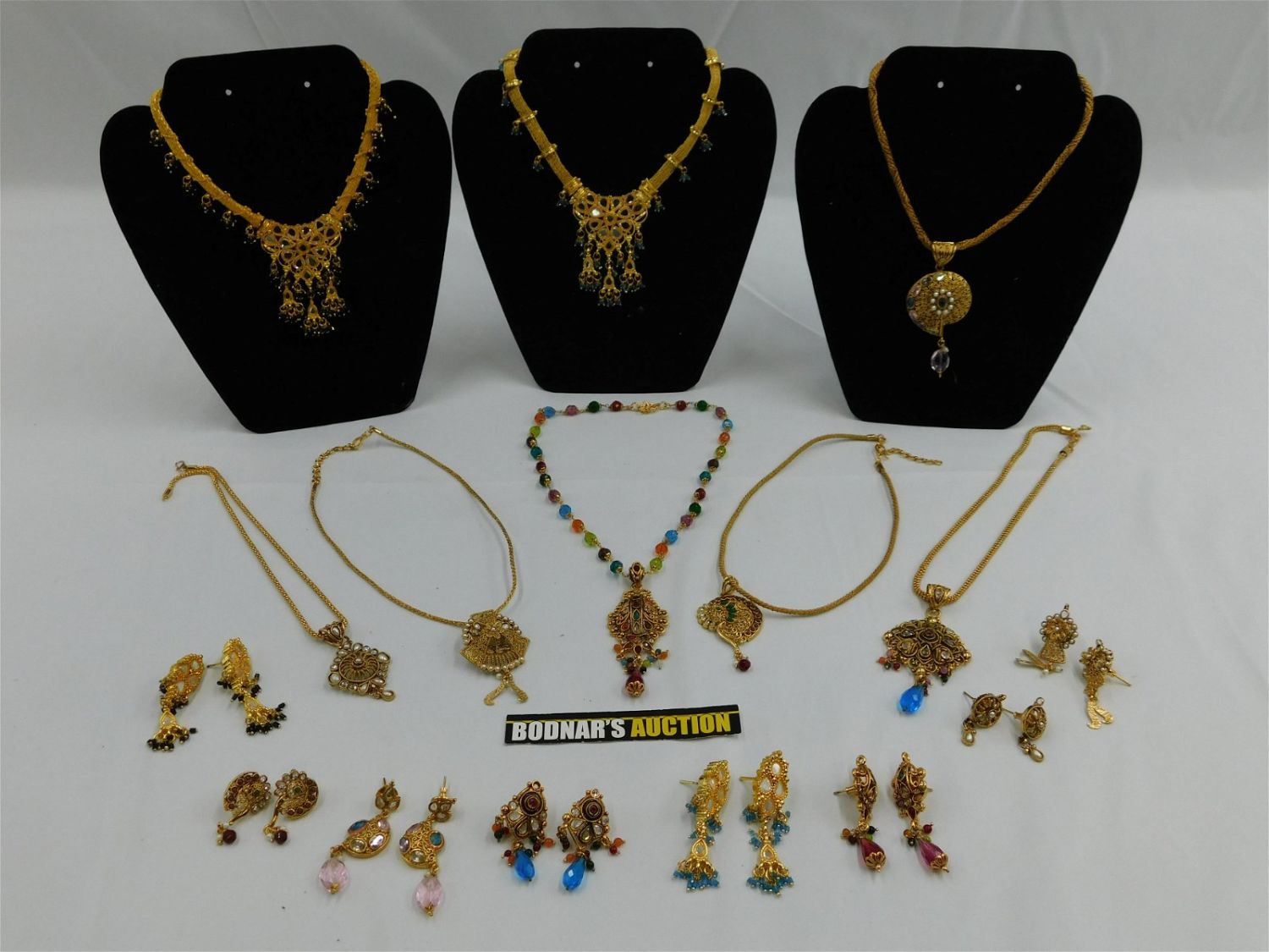 Lot of 8 Indian Necklace and Earring Sets. All in Gold Tone with Various Colored Stones. All invoices must be paid within 24 hours of the sale. All items are shipped USPS or UPS and will be billed separately. A $12 handling fee is added to the shipping price per lot if shipped in house. Some items or large quantity of purchases will be packed and shipped via the Monmouth Junction UPS store. Local pickups are at our Monmouth Junction location on Friday, Saturday and Monday ONLY! All pickups are by appointment only. Any condition issues will be listed in the description. Please read the terms for full information.