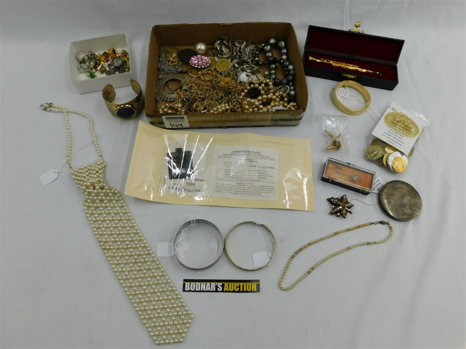 Lot of Costume Jewelry and Misc. Items including Faux Pearls, Silver Tone Compact, Mini Clarinet – 1:6 Bach Music Czech, 14kt Gold Filled Bangle, Vintage Trifari Brooch, Gold Toned Jewelry, Fraternal Pin and Much More. All invoices must be paid within 24 hours of the sale. All items are shipped USPS or UPS and will be billed separately. A $12 handling fee is added to the shipping price per lot if shipped in house. Some items or large quantity of purchases will be packed and shipped via the Monmouth Junction UPS store. Local pickups are at our Monmouth Junction location on Friday, Saturday and Monday ONLY! All pickups are by appointment only. Any condition issues will be listed in the description. Please read the terms for full information.