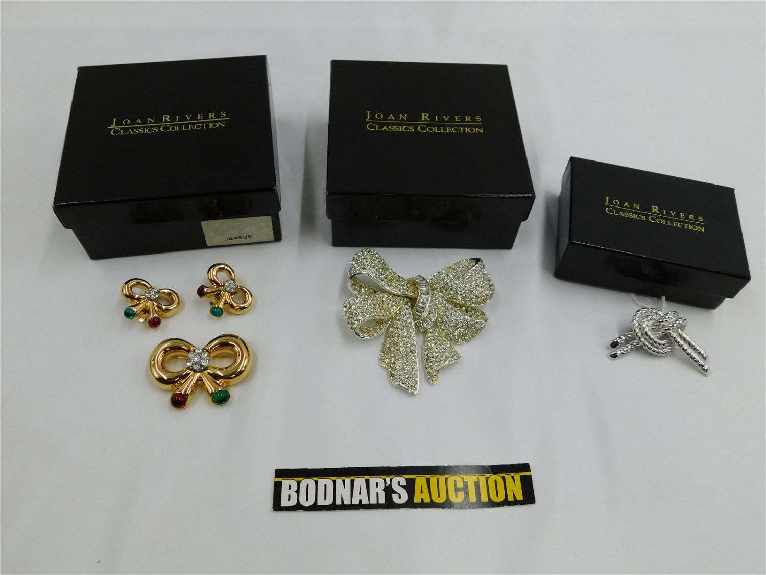 Lot of 3 Joan Rivers Classics Collection Bow Pins. One pin is a set with matching earrings – Gold tone with multi-colored stones. One has silver tone and one has clear rhinestones. All are signed. Has original boxes and paperwork. All have original bags. Measures between 1.75" – 2.75". All invoices must be paid within 24 hours of the sale. All items are shipped USPS or UPS and will be billed separately. A $12 handling fee is added to the shipping price per lot if shipped in house. Some items or large quantity of purchases will be packed and shipped via the Monmouth Junction UPS store. Local pickups are at our Monmouth Junction location on Friday, Saturday and Monday ONLY! All pickups are by appointment only. Any condition issues will be listed in the description. Please read the terms for full information.
