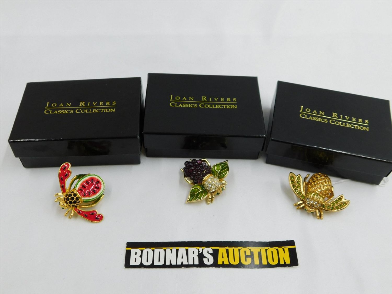 Lot of 3 Joan Rivers Classics Collection Bee Pins including Watermelon, Pineapple and Grape done in enamel and rhinestones. All have green rhinestone eyes. All are signed. Has original packaging and paperwork. All have original bags. Measures approx. 1.5". All invoices must be paid within 24 hours of the sale. All items are shipped USPS or UPS and will be billed separately. A $12 handling fee is added o the shipping price per lot if shipped in house. Some items or large quantity of purchases will be packed and shipped via the Monmouth Junction UPS store. Local pickups are at our Monmouth Junction location on Friday, Saturday and Monday ONLY! All pickups are by appointment only. Any condition issues will be listed in the description. Please read the terms for full information.