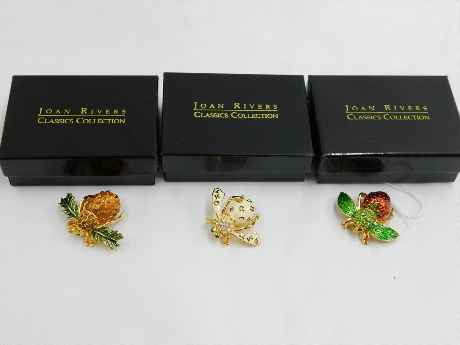Lot of 3 Joan Rivers Classics Collection Bee Pins. All in gold tone, enamel and rhinestone. Including Pinecone, Strawberry, and Spelling Bee. All have green rhinestone eyes. All are signed. All have original packaging and paperwork. All have original bags. Measures approx. 1.5" – 1.75". All invoices must be paid within 24 hours of the sale. All items are shipped USPS or UPS and will be billed separately. A $12 handling fee is added o the shipping price per lot if shipped in house. Some items or large quantity of purchases will be packed and shipped via the Monmouth Junction UPS store. Local pickups are at our Monmouth Junction location on Friday, Saturday and Monday ONLY! All pickups are by appointment only. Any condition issues will be listed in the description. Please read the terms for full information.