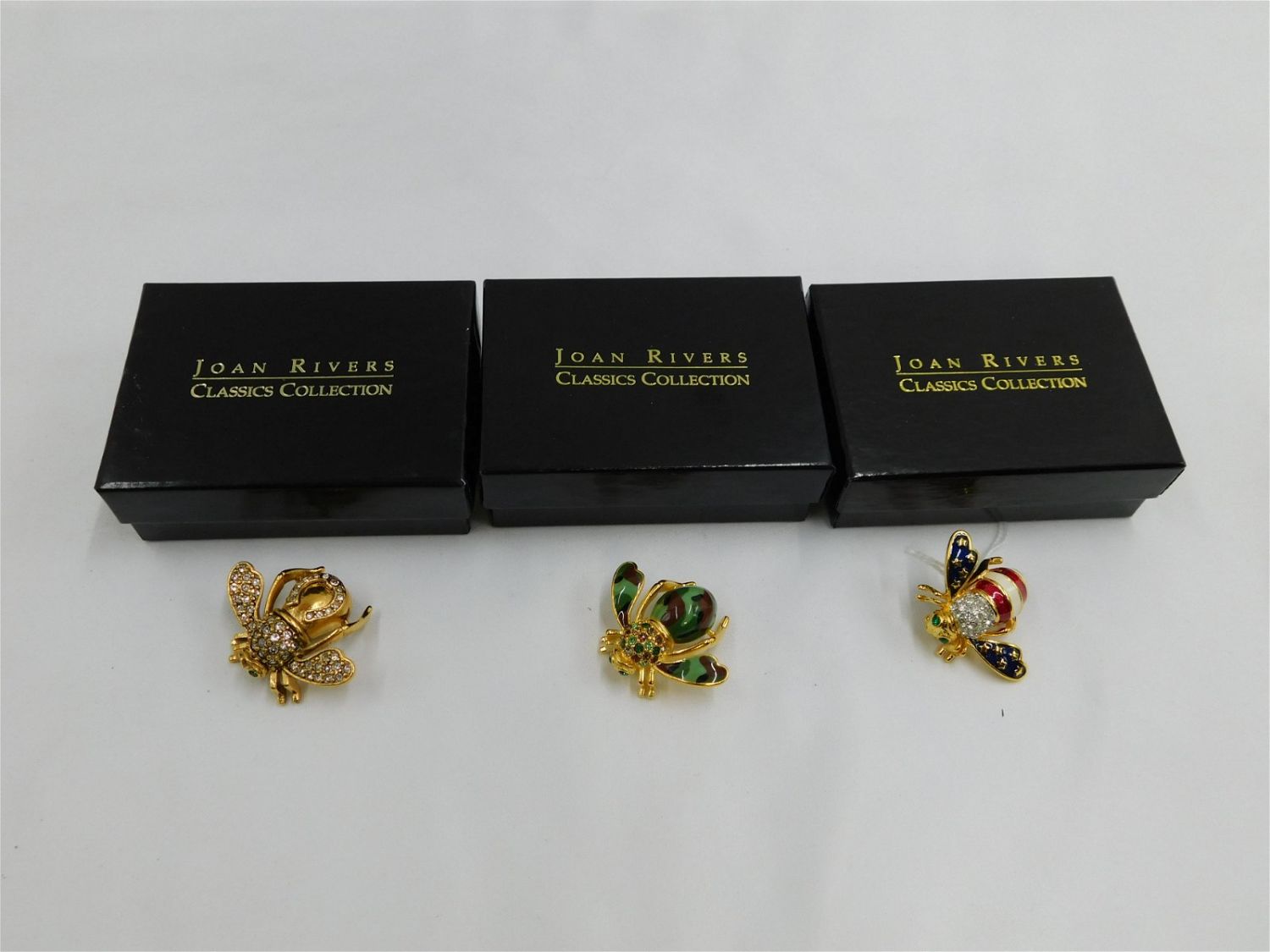 Lot of 3 Joan Rivers Classics Collection Bee Pins. Including Green Camouflage in gold tone and rhinestones, Stars and Stripes in gold tone enamel and Lucky Horseshoe in Enamel and Rhinestones. All have green rhinestone eyes. All are signed. All have original packaging and paperwork. All have original bags. Measures approx. 1.5" – 1.75". All invoices must be paid within 24 hours of the sale. All items are shipped USPS or UPS and will be billed separately. A $12 handling fee is added o the shipping price per lot if shipped in house. Some items or large quantity of purchases will be packed and shipped via the Monmouth Junction UPS store. Local pickups are at our Monmouth Junction location on Friday, Saturday and Monday ONLY! All pickups are by appointment only. Any condition issues will be listed in the description. Please read the terms for full information.
