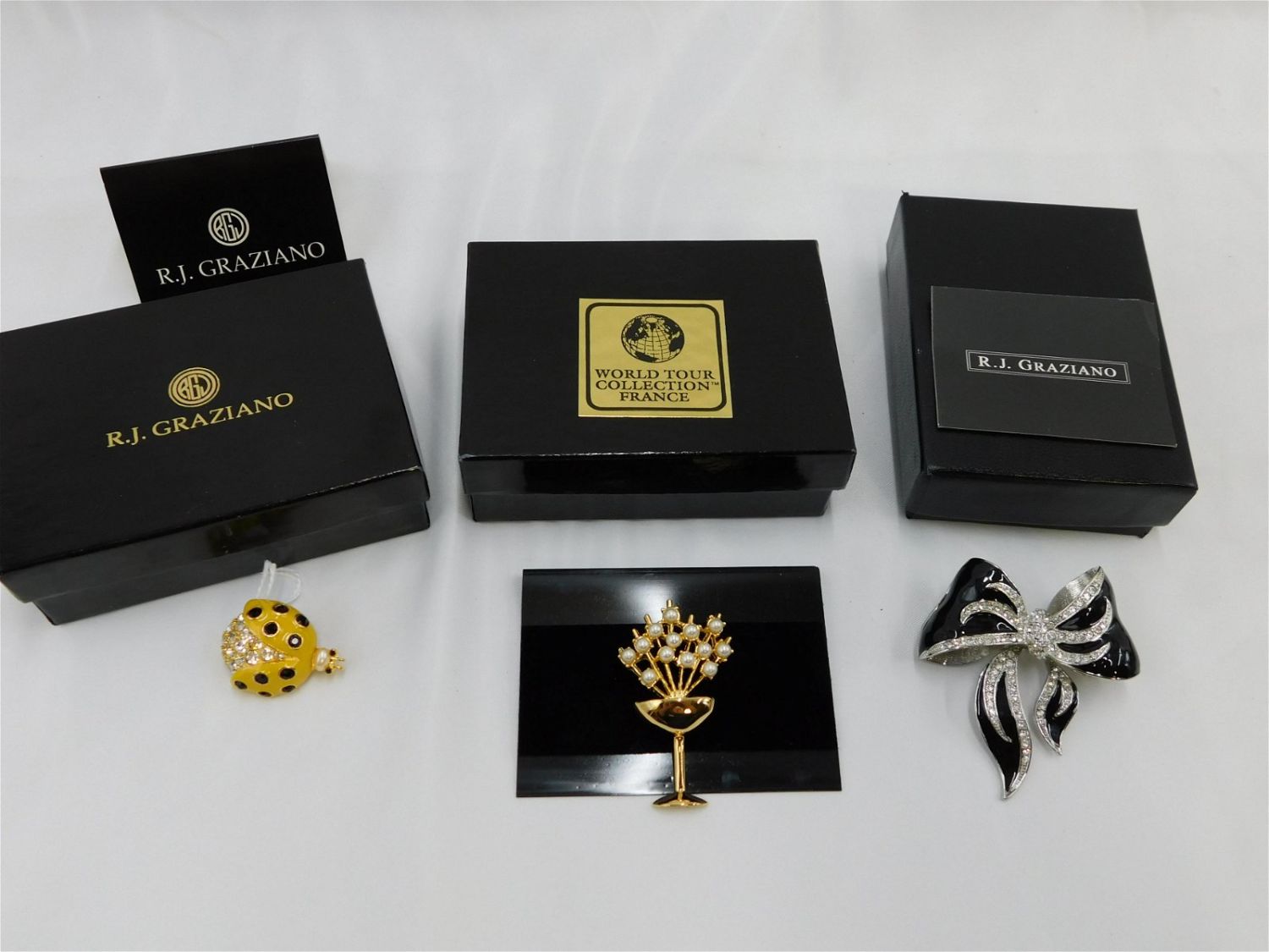 Lot of 3 Designer Costume Jewelry Pins including Silver tone enamel bow pin by RJ Graziano, Gold tone enamel and rhinestone pin by RJ Graziano, and gold tone and faux pearl champagne glass pin by World Tour Collection France. All have original boxes and paperwork. Measures 1.25" – 2.25". All invoices must be paid within 24 hours of the sale. All items are shipped USPS or UPS and will be billed separately. A $12 handling fee is added to the shipping price per lot if shipped in house. Some items or large quantity of purchases will be packed and shipped via the Monmouth Junction UPS store. Local pickups are at our Monmouth Junction location on Friday, Saturday and Monday ONLY! All pickups are by appointment only. Any condition issues will be listed in the description. Please read the terms for full information.