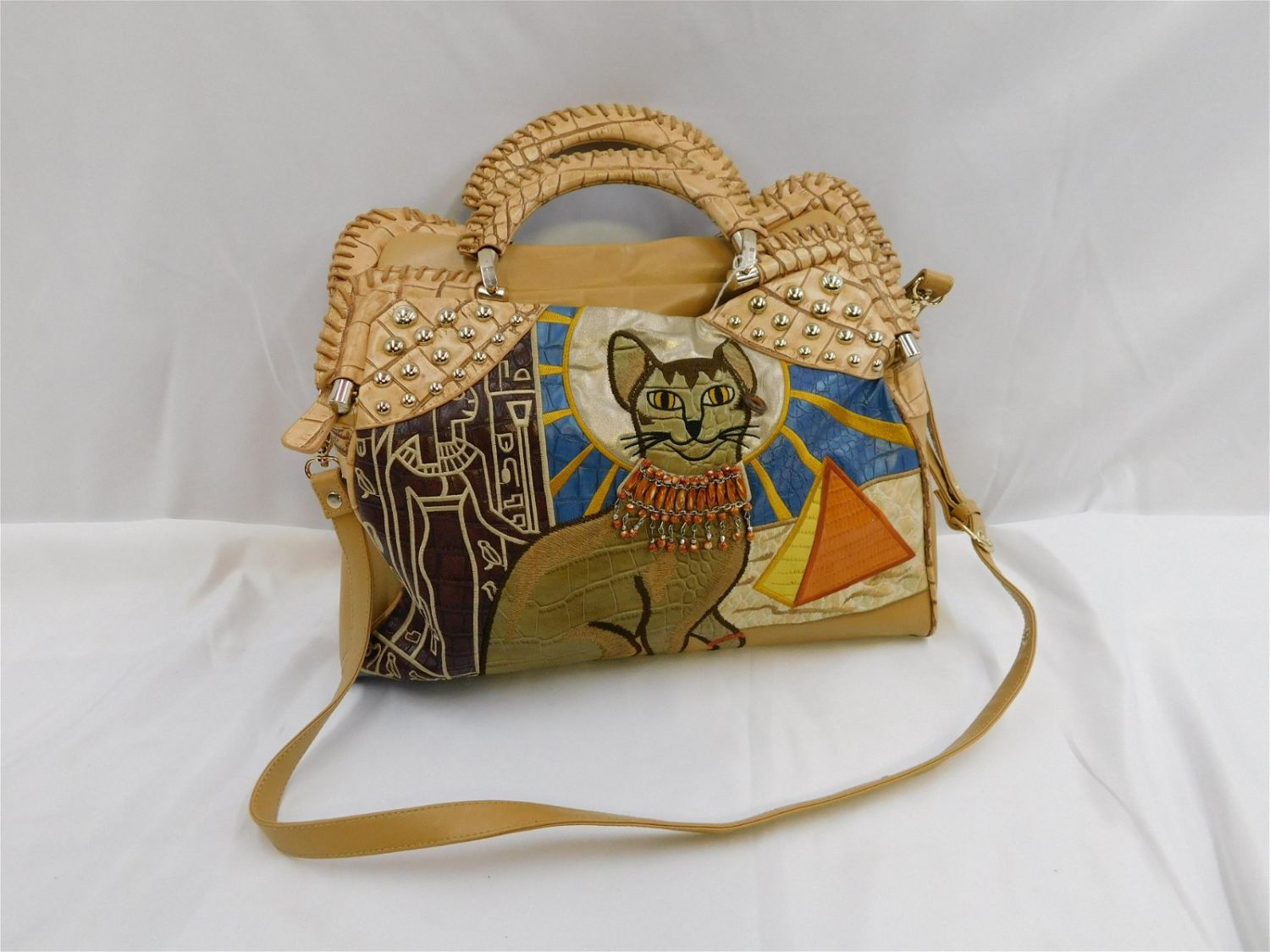 Sharif Leather Egyptian Cat Handbag with Beaded Necklace. In New Condition with Dustcover. Measures 13.5" long x 14.5" tall. All invoices must be paid within 24 hours of the sale. All items are shipped USPS or UPS and will be billed separately. A $12 handling fee is added to the shipping price per lot if shipped in house. Some items or large quantity of purchases will be packed and shipped via the Monmouth Junction UPS store. Local pickups are at our Monmouth Junction location on Friday, Saturday and Monday ONLY! All pickups are by appointment only. Any condition issues will be listed in the description. Please read the terms for full information.