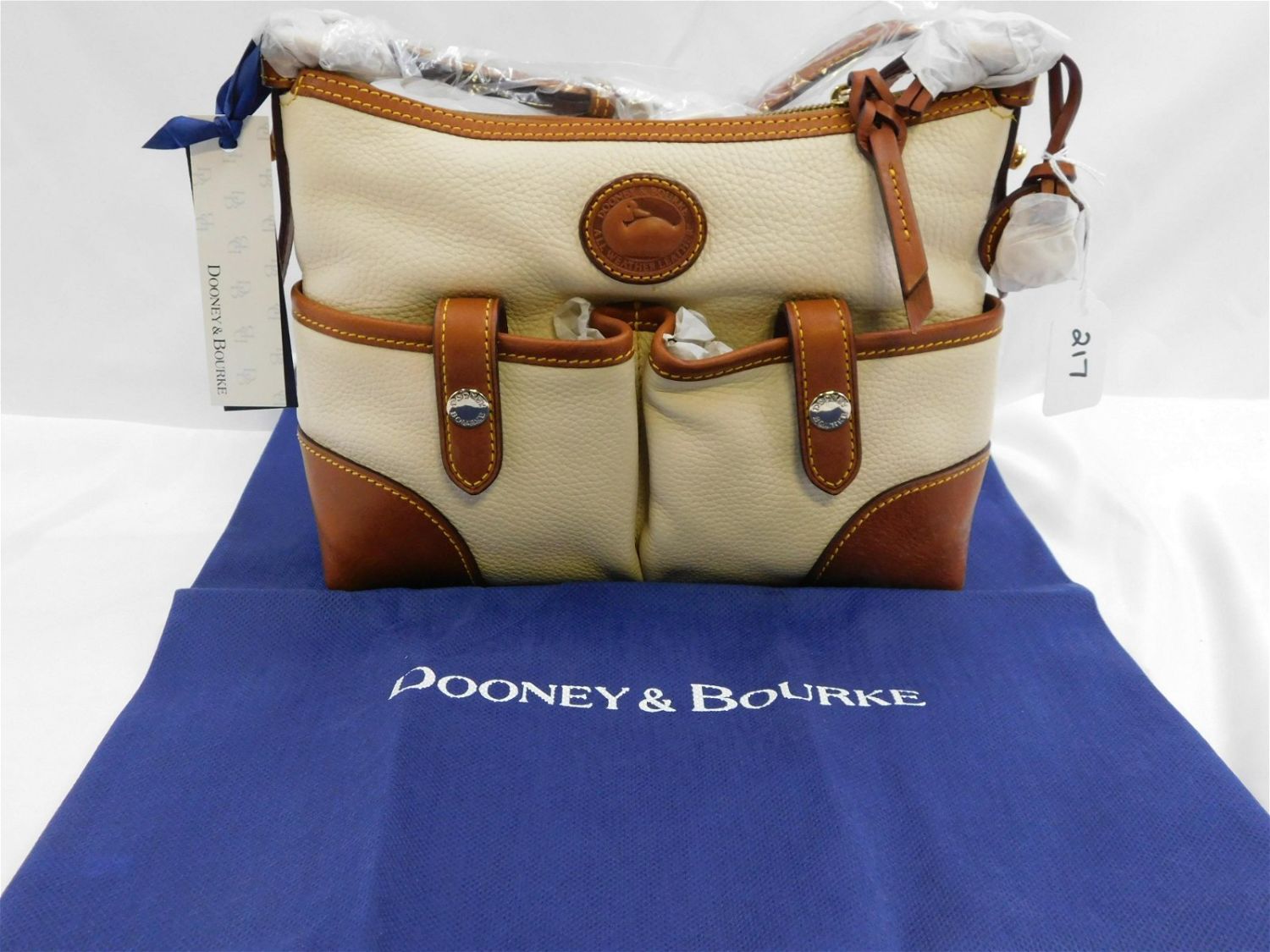 Dooney & Burke Ivory Letter Carrier. In Ivory Leather with Brown Leather Handles and Accents. Includes Dustbag. Measures 10" wide x 8.5" to top of bag. New with Tags and Dooney and Burke Tissue Paper. Removed Purses from original sealed outer bags for photographing purposes. All invoices must be paid within 24 hours of the sale. All items are shipped USPS or UPS and will be billed separately. A $12 handling fee is added to the shipping price per lot if shipped in house. Some items or large quantity of purchases will be packed and shipped via the Monmouth Junction UPS store. Local pickups are at our Monmouth Junction location on Friday, Saturday and Monday ONLY! All pickups are by appointment only. Any condition issues will be listed in the description. Please read the terms for full information.