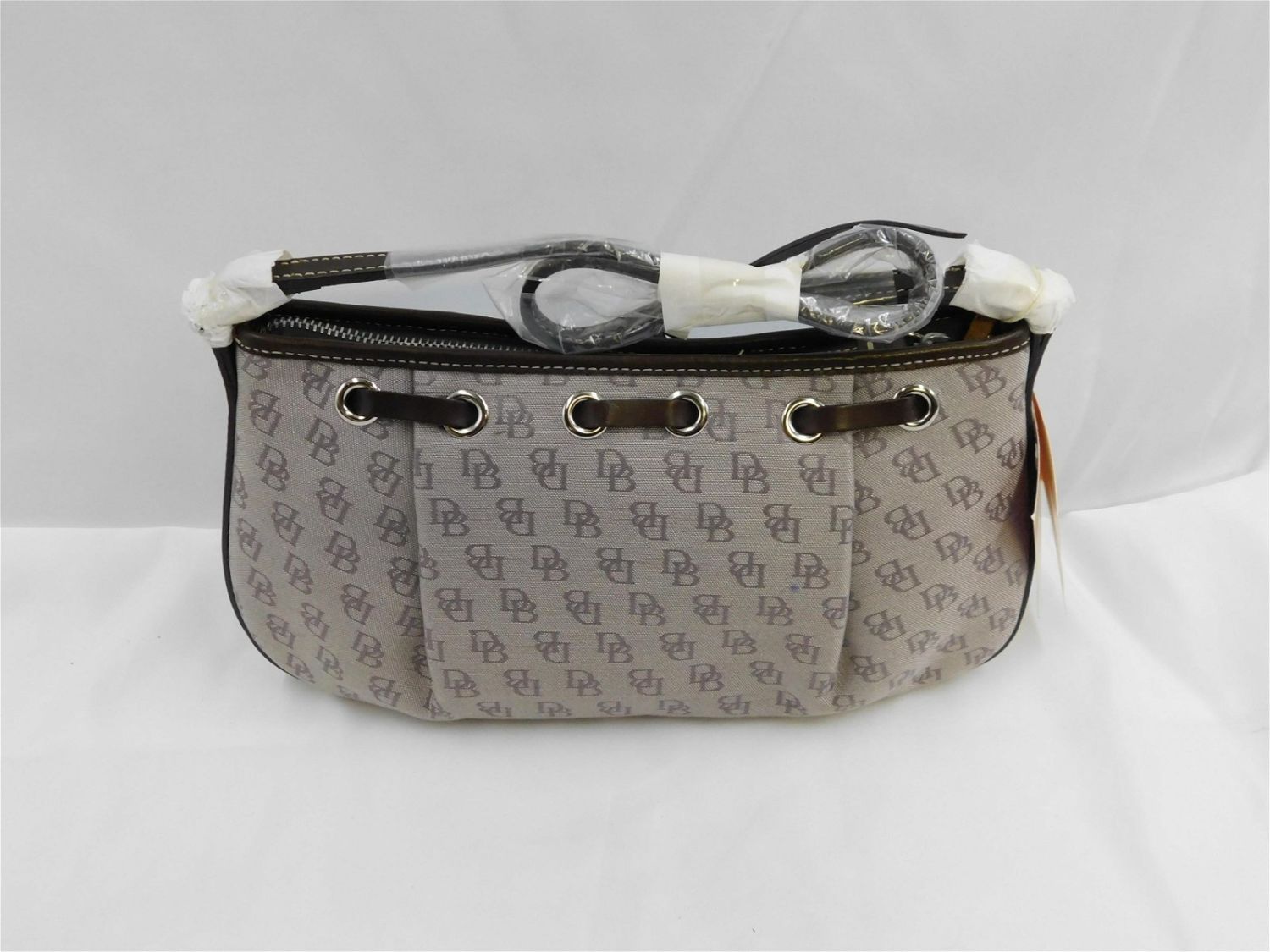 Dooney & Burke Platinum Tassel Top Zip. Done in silver cloth with dark brown leather accents and handle. Measures 10.5" wide x 6" to top of bag. Includes Dustbag and Longer Strap. New with Tags. Removed Purses from original sealed outer bags for photographing purposes. All invoices must be paid within 24 hours of the sale. All items are shipped USPS or UPS and will be billed separately. A $12 handling fee is added to the shipping price per lot if shipped in house. Some items or large quantity of purchases will be packed and shipped via the Monmouth Junction UPS store. Local pickups are at our Monmouth Junction location on Friday, Saturday and Monday ONLY! All pickups are by appointment only. Any condition issues will be listed in the description. Please read the terms for full information.