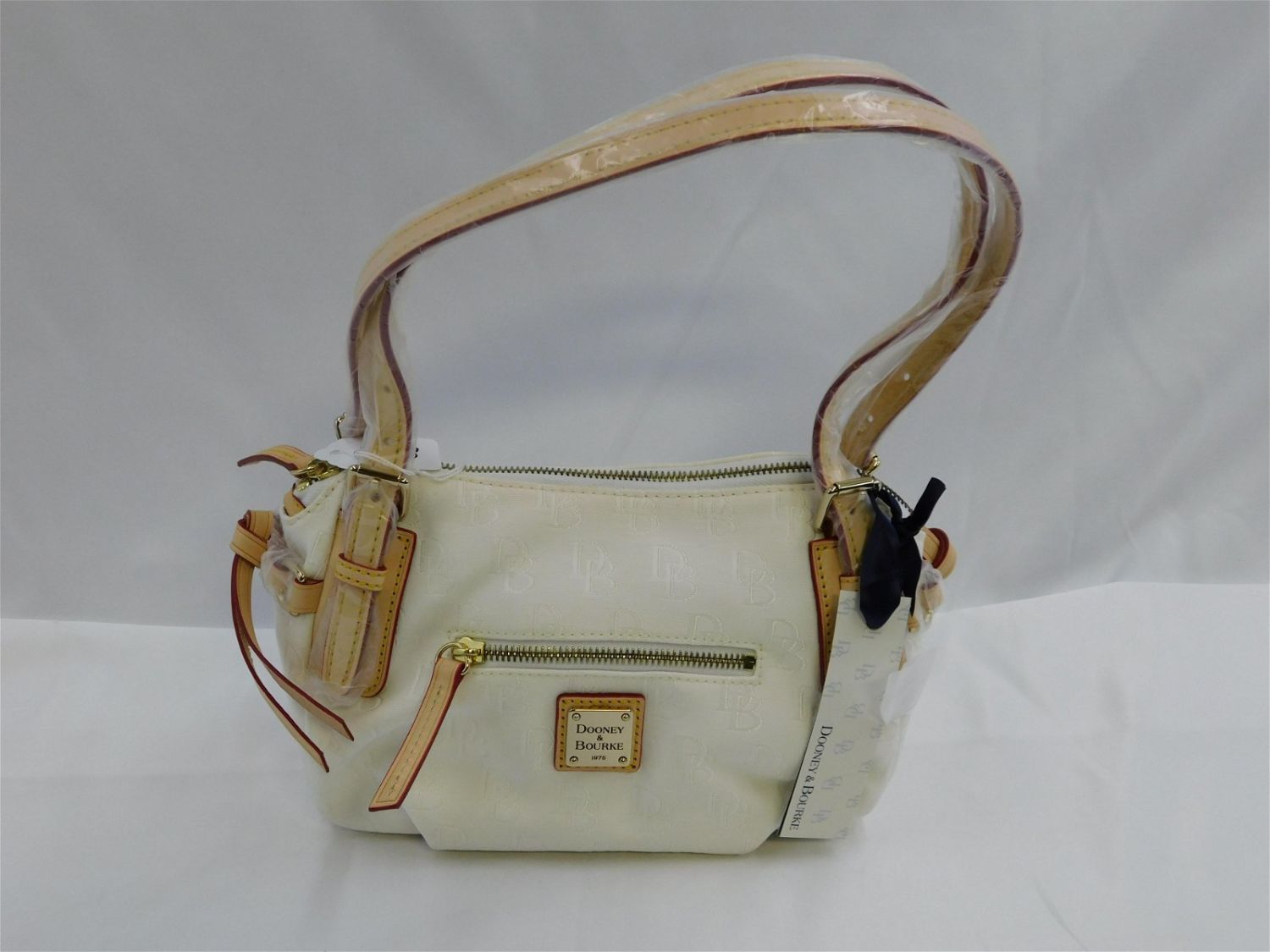 Dooney & Burke Small Nina in White Cloth with Cream Leather Accents. Measures 10" wide x 14.5" tall. New with Tags. Removed Purses from original sealed outer bags for photographing purposes. All invoices must be paid within 24 hours of the sale. All items are shipped USPS or UPS and will be billed separately. A $12 handling fee is added to the shipping price per lot if shipped in house. Some items or large quantity of purchases will be packed and shipped via the Monmouth Junction UPS store. Local pickups are at our Monmouth Junction location on Friday, Saturday and Monday ONLY! All pickups are by appointment only. Any condition issues will be listed in the description. Please read the terms for full information.