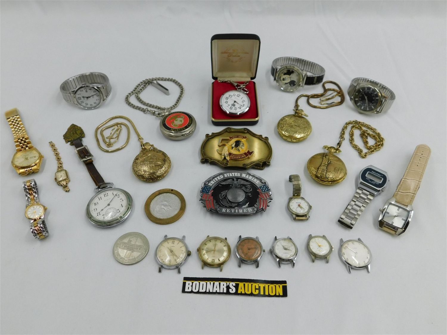Lot of Watches including Many Tourist/RR Pocket watches, Marine Corp Pocket Watch, Wristwatches by Citizen, Pulsar, Timex and More. All invoices must be paid within 24 hours of the sale. All items are shipped USPS or UPS and will be billed separately. A $12 handling fee is added to the shipping price per lot if shipped in house. Some items or large quantity of purchases will be packed and shipped via the Monmouth Junction UPS store. Local pickups are at our Monmouth Junction location on Friday, Saturday and Monday ONLY! All pickups are by appointment only. Any condition issues will be listed in the description. Please read the terms for full information.