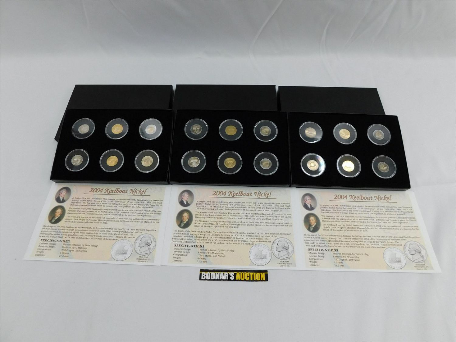 3 Sets of 2004 Keelboat Nickels. Obverse features Thomas Jefferson by Felix Schlagg and the Reverse features Keelboat used by Lois and Clark. Each set contains 6 Nickels. 4 of the nickels are layered in platinum and 2 are in 24kt gold. Comes with original box. Each nickel is in coin case. Has original paperwork. All invoices must be paid within 24 hours of the sale. All items are shipped USPS or UPS and will be billed separately. A $12 handling fee is added to the shipping price per lot if shipped in house. Some items or large quantity of purchases will be packed and shipped via the Monmouth Junction UPS store. Local pickups are at our Monmouth Junction location on Friday, Saturday and Monday ONLY! All pickups are by appointment only. Any condition issues will be listed in the description. Please read the terms for full information.