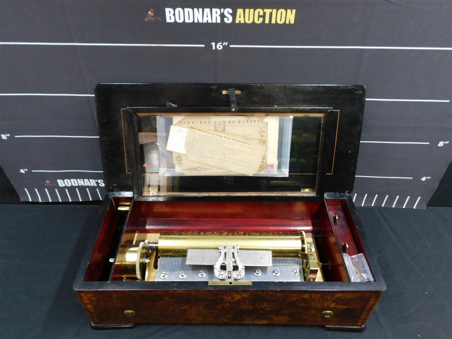 Burled mahogany 19th century German music box, has original paper label, plays 6 songs, case has 2 wear spots on front of case, has all teeth and runs. It plays slow and may need an adjustment. Measures 6 inches tall by 20 inches long. All invoices must be paid within 24 hours of the sale. This auction is Local Pick Up, Shipping with Liveauctioneers Live Ship, In-House Shipping on small items only, or with the Local UPS Store in Monmouth Junction, NJ. Local pickups are at our Monmouth Junction location on Friday, Saturday and Monday ONLY! All pickups are by appointment only. Any condition issues will be listed in the description. Please read the terms for full information.