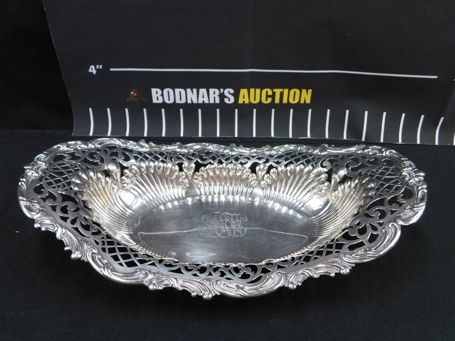 Sterling Silver Heavy Repose and Open Pierce Work Center Bowl/Bread Basket. Monogrammed. Marked on back Sterling 4051 925. Measures 3" tall x 15" wide. All invoices must be paid within 24 hours of the sale. This auction is Local Pick Up, Shipping with Liveauctioneers Live Ship, In-House Shipping on small items only, or with the Local UPS Store in Monmouth Junction, NJ. Local pickups are at our Monmouth Junction location on Friday, Saturday and Monday ONLY! All pickups are by appointment only. Any condition issues will be listed in the description. Please read the terms for full information.