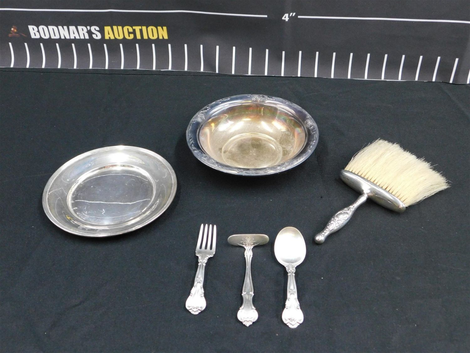 Lot of Sterling Silver Tableware Pieces including Sterling Handled Brush, Heirloom Sterling Bowl, Stieff Sterling Small Plate, and 3 Piece Gorham Sterling Baby Spoon, Fork, and Scraper. Largest measures 2" tall x 6.5" in diameter. All invoices must be paid within 24 hours of the sale. This auction is Local Pick Up, Shipping with Liveauctioneers Live Ship, In-House Shipping on small items only, or with the Local UPS Store in Monmouth Junction, NJ. Local pickups are at our Monmouth Junction location on Friday, Saturday and Monday ONLY! All pickups are by appointment only. Any condition issues will be listed in the description. Please read the terms for full information.
