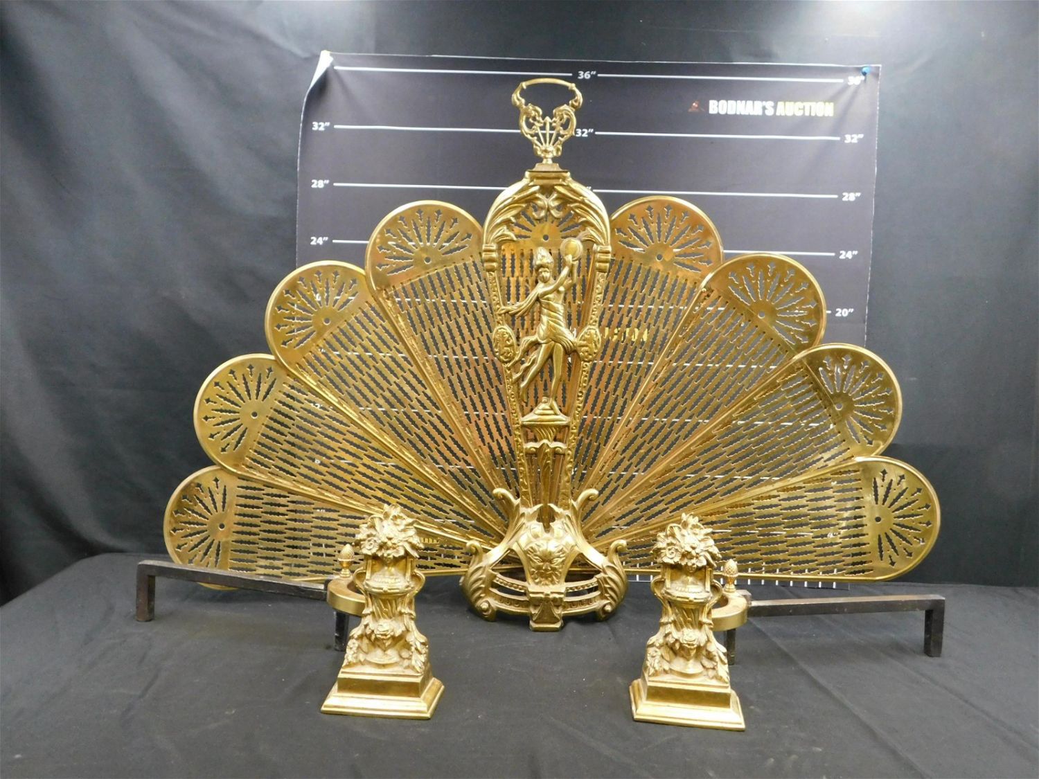 Three Piece Brass Fireplace Set including Decorative Fan Fire Screen with Pair of French Style Flower Andirons. The largest measures 34" tall x 11" wide. All invoices must be paid within 24 hours of the sale. This auction is Local Pick Up, Shipping with Liveauctioneers Live Ship, In-House Shipping on small items only, or with the Local UPS Store in Monmouth Junction, NJ. Local pickups are at our Monmouth Junction location on Friday, Saturday and Monday ONLY! All pickups are by appointment only. Any condition issues will be listed in the description. Please read the terms for full information.