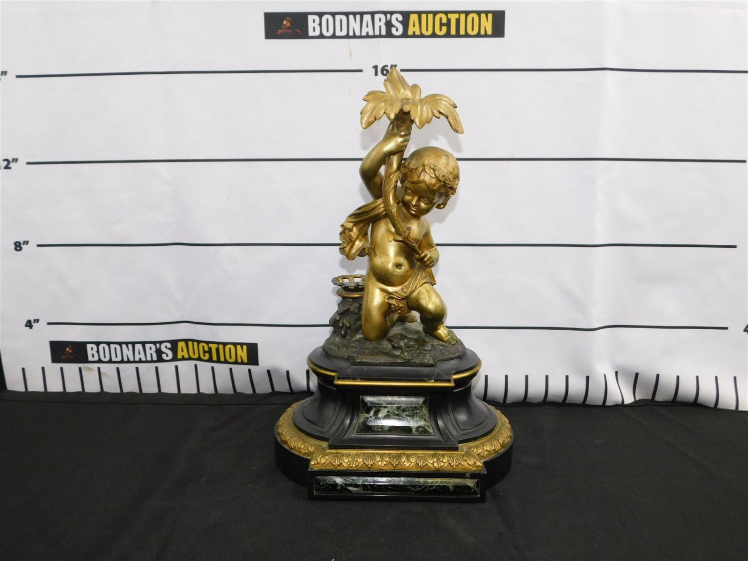 19th Century Bronze Statue on Marble Base. The marble Base has chips around the rim – See Photo. Bronze detaches from base and base detaches in 3 sections. All need to be refastened. Measures 16" tall x 10.5" wide x 7.5" deep. All invoices must be paid within 24 hours of the sale. This auction is Local Pick Up, Shipping with Liveauctioneers Live Ship, In-House Shipping on small items only, or with the Local UPS Store in Monmouth Junction, NJ. Local pickups are at our Monmouth Junction location on Friday, Saturday and Monday ONLY! All pickups are by appointment only. Any condition issues will be listed in the description. Please read the terms for full information.