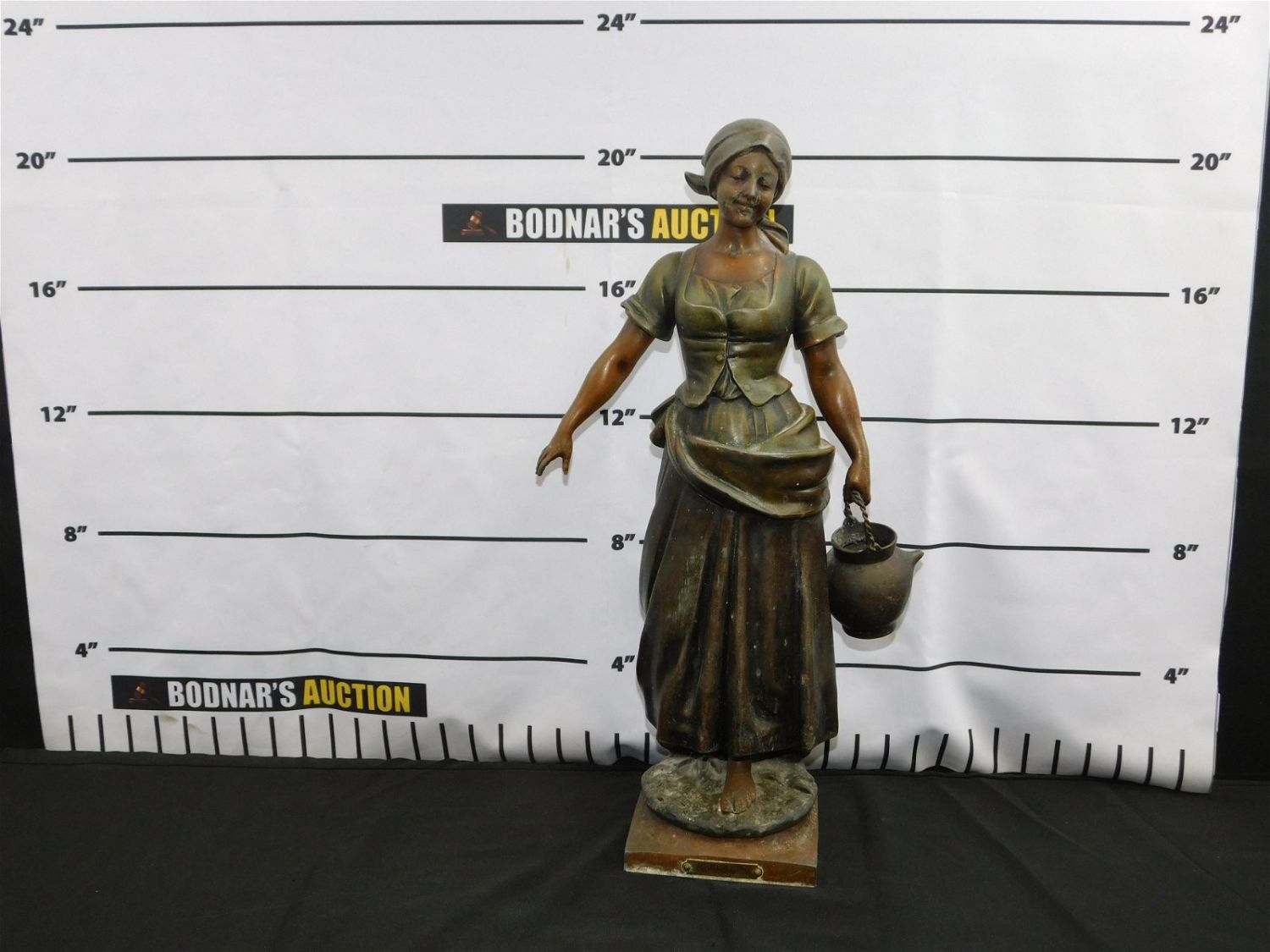 19th Century Mixed Metal Statue of Working Woman Getting Water from a Field. Base marked A. U. Scotte. Has French Button Stamp on the Rear. Plaque marked Perrette Par AJ Scotte. Water Jug Attached with Hole on Side of Dress. Is not secure – just needs a dab of glue. Does not appear to ruin the integrity of the piece. Measures 21" tall x 11" wide x 5.5" deep. All invoices must be paid within 24 hours of the sale. This auction is Local Pick Up, Shipping with Liveauctioneers Live Ship, In-House Shipping on small items only, or with the Local UPS Store in Monmouth Junction, NJ. Local pickups are at our Monmouth Junction location on Friday, Saturday and Monday ONLY! All pickups are by appointment only. Any condition issues will be listed in the description. Please read the terms for full information.