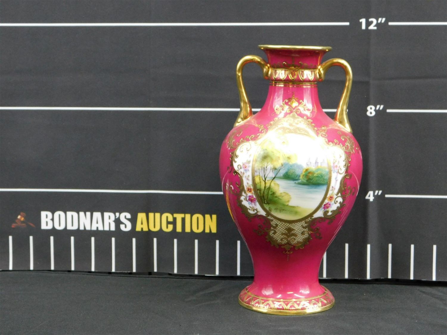 Noritake Hand Painted Double Handled Vase. Depicting Lake Scenes. Measures 11.5" tall x 6.5" wide. All invoices must be paid within 24 hours of the sale. This auction is Local Pick Up, Shipping with Liveauctioneers Live Ship, In-House Shipping on small items only, or with the Local UPS Store in Monmouth Junction, NJ. Local pickups are at our Monmouth Junction location on Friday, Saturday and Monday ONLY! All pickups are by appointment only. Any condition issues will be listed in the description. Please read the terms for full information.