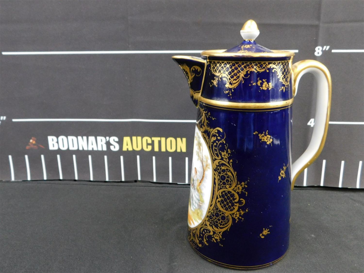 19th Century Hand Painted and Transferware Dresden Coffee Pot. Cobalt Blue and Heavy Gold Gilt depicting a young lady seated with a man standing. Measures 9.5" tall x 6" wide. All invoices must be paid within 24 hours of the sale. This auction is Local Pick Up, Shipping with Liveauctioneers Live Ship, In-House Shipping on small items only, or with the Local UPS Store in Monmouth Junction, NJ. Local pickups are at our Monmouth Junction location on Friday, Saturday and Monday ONLY! All pickups are by appointment only. Any condition issues will be listed in the description. Please read the terms for full information.
