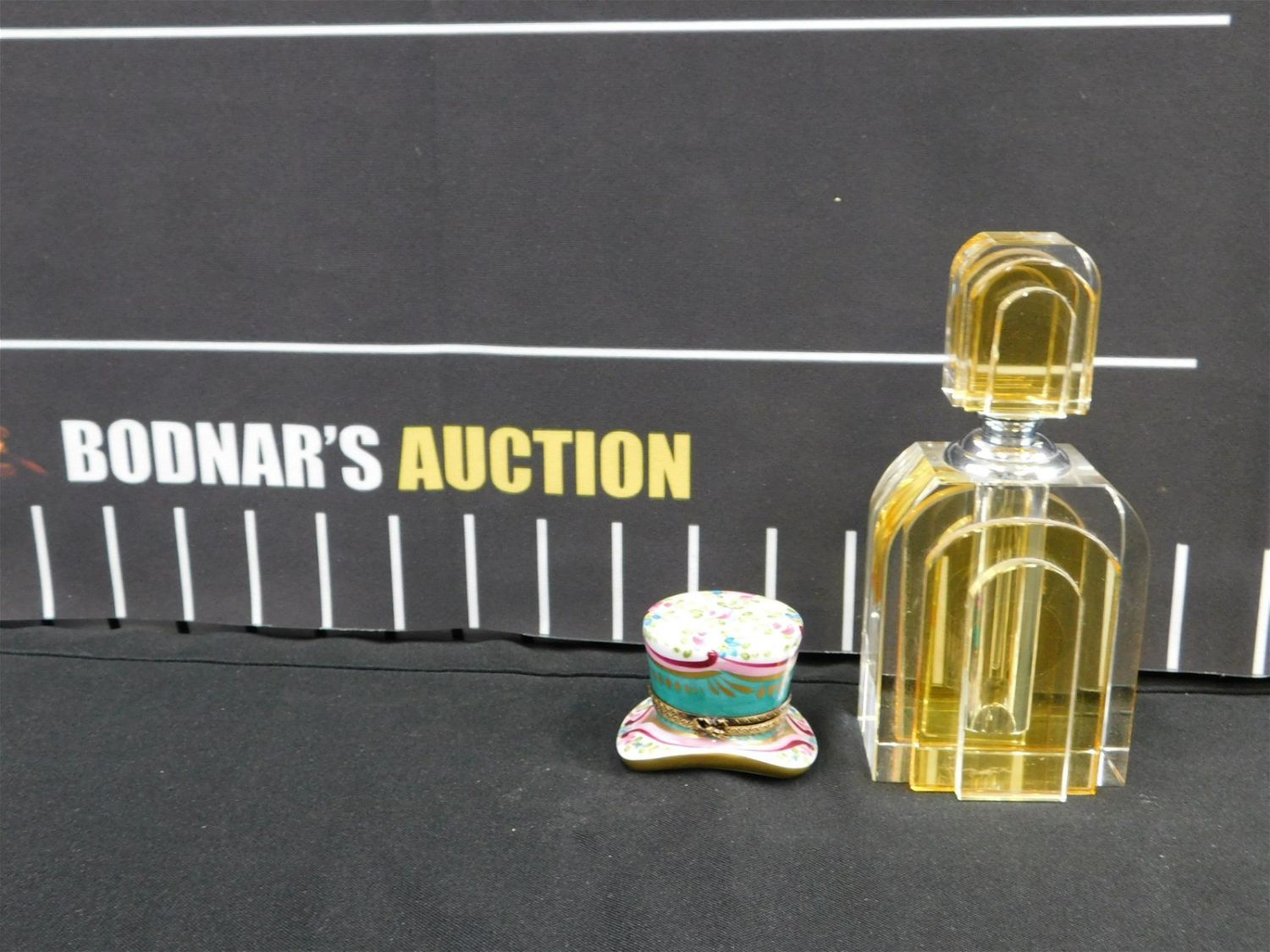Lot of 2 Perfume Bottles including a Limoges France Porcelain Top Hat Dresser Box with a Mini Perfume Bottle inside and an Art Deco Style Amber and Clear Perfume Bottle. Largest measures 6" tall x 3" wide. All invoices must be paid within 24 hours of the sale. This auction is Local Pick Up, Shipping with Liveauctioneers Live Ship, In-House Shipping on small items only, or with the Local UPS Store in Monmouth Junction, NJ. Local pickups are at our Monmouth Junction location on Friday, Saturday and Monday ONLY! All pickups are by appointment only. Any condition issues will be listed in the description. Please read the terms for full information.