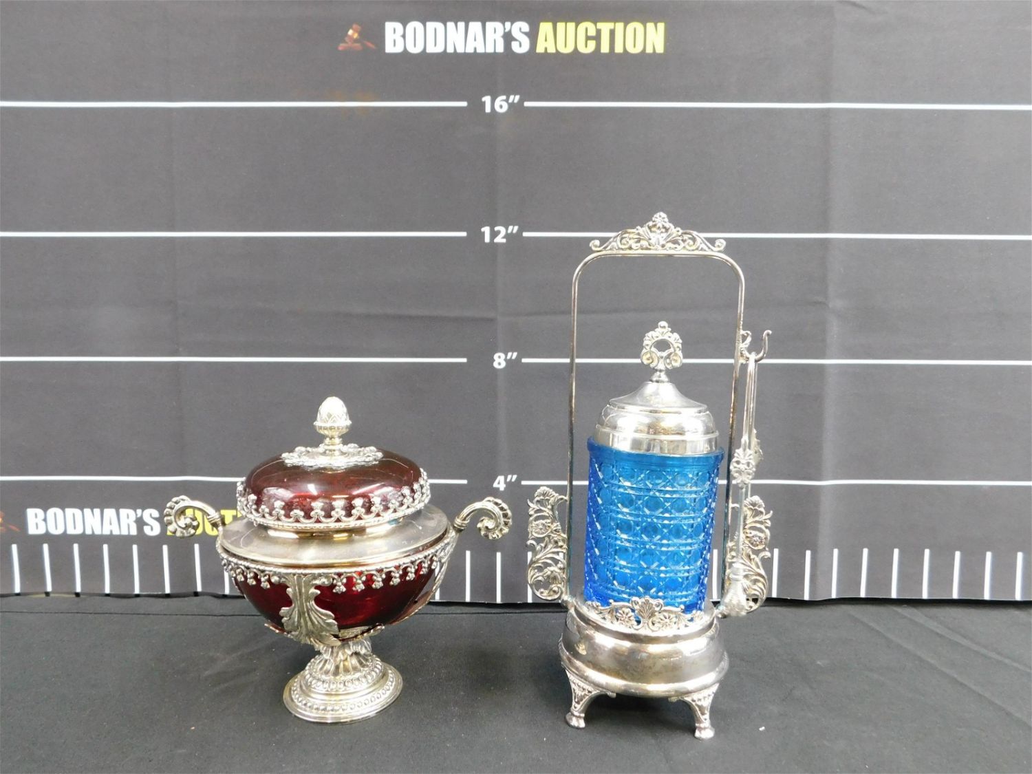 Group Lot of 2 Victorian Serving Pieces including Silver Plated Pickle Caster and Double Handled Cranberry Glass Inserted Oversized Sugar Bowl. The largest measures 13" tall x 6" wide. All invoices must be paid within 24 hours of the sale. This auction is Local Pick Up, Shipping with Liveauctioneers Live Ship, In-House Shipping on small items only, or with the Local UPS Store in Monmouth Junction, NJ. Local pickups are at our Monmouth Junction location on Friday, Saturday and Monday ONLY! All pickups are by appointment only. Any condition issues will be listed in the description. Please read the terms for full information.
