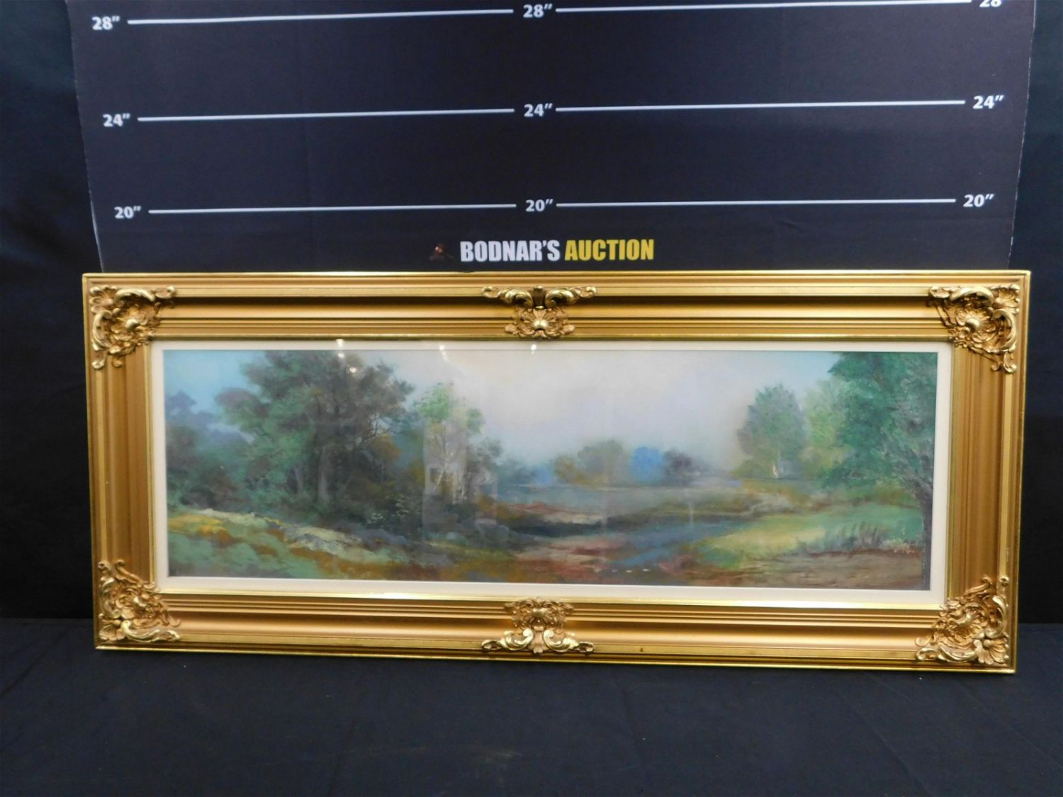 Framed 19th Century Pastel Painting depicting a Lake in the Woods. Appears to be signed lower left. Covered under the matte. Measures 18" tall x 42" wide. All invoices must be paid within 24 hours of the sale. This auction is Local Pick Up, Shipping with Liveauctioneers Live Ship, In-House Shipping on small items only, or with the Local UPS Store in Monmouth Junction, NJ. Local pickups are at our Monmouth Junction location on Friday, Saturday and Monday ONLY! All pickups are by appointment only. Any condition issues will be listed in the description. Please read the terms for full information.