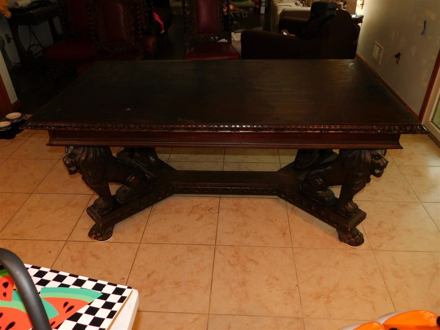 Carved lion base dining room table, paw footed with (4) full-bodied lion supports. Has wear to the base, circa reproduction 1980s. Measures 30" tall x 68.5" wide x 39" deep. All invoices must be paid within 24 hours of the sale. This auction is Local Pick Up, Shipping with Liveauctioneers Live Ship, In-House Shipping on small items only, or with the Local UPS Store in Monmouth Junction, NJ. Local pickups are at our Monmouth Junction location on Friday, Saturday and Monday ONLY! All pickups are by appointment only. Any condition issues will be listed in the description. Please read the terms for full information.