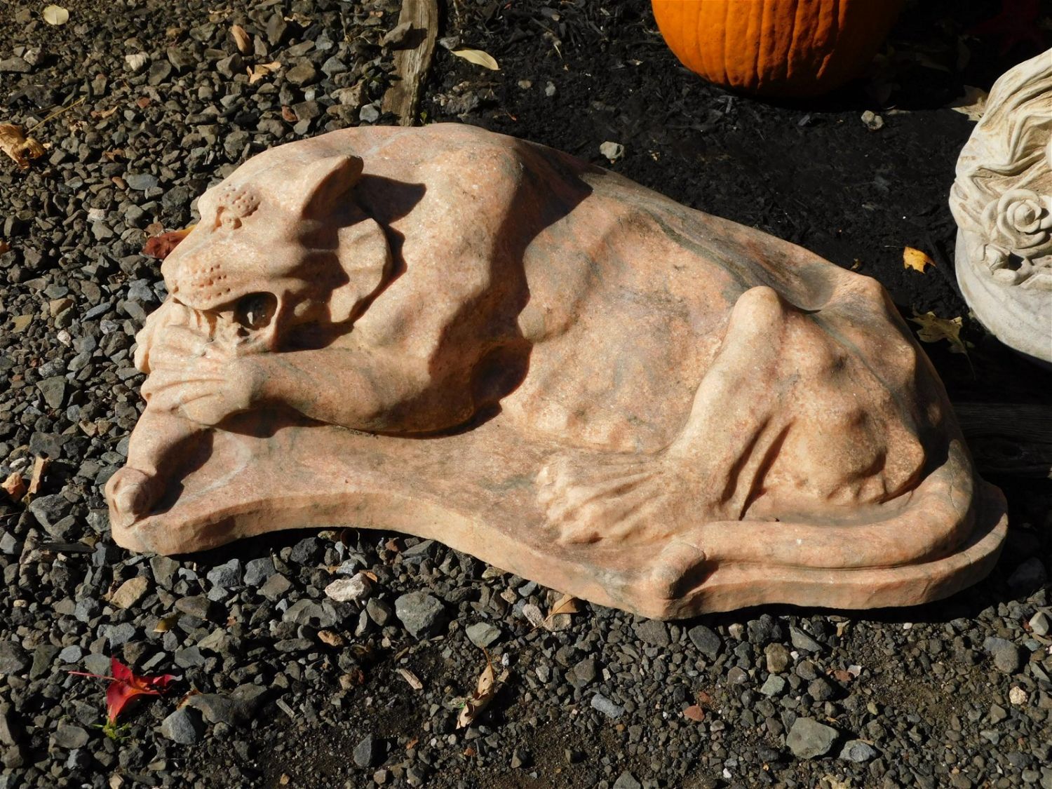 Turn of the Century Carved Mable Seated Lion eating Statue. Has age-stressed cracking but is overall in good condition. The back of statue base is missing but can not be seen from the front. Measures 14" tall x 39" wide" x 15" deep. Easily 400 pounds. All invoices must be paid within 24 hours of the sale. This auction is Local Pick Up, Shipping with Liveauctioneers Live Ship, In-House Shipping on small items only, or with the Local UPS Store in Monmouth Junction, NJ. Local pickups are at our Monmouth Junction location on Friday, Saturday and Monday ONLY! All pickups are by appointment only. Any condition issues will be listed in the description. Please read the terms for full information.