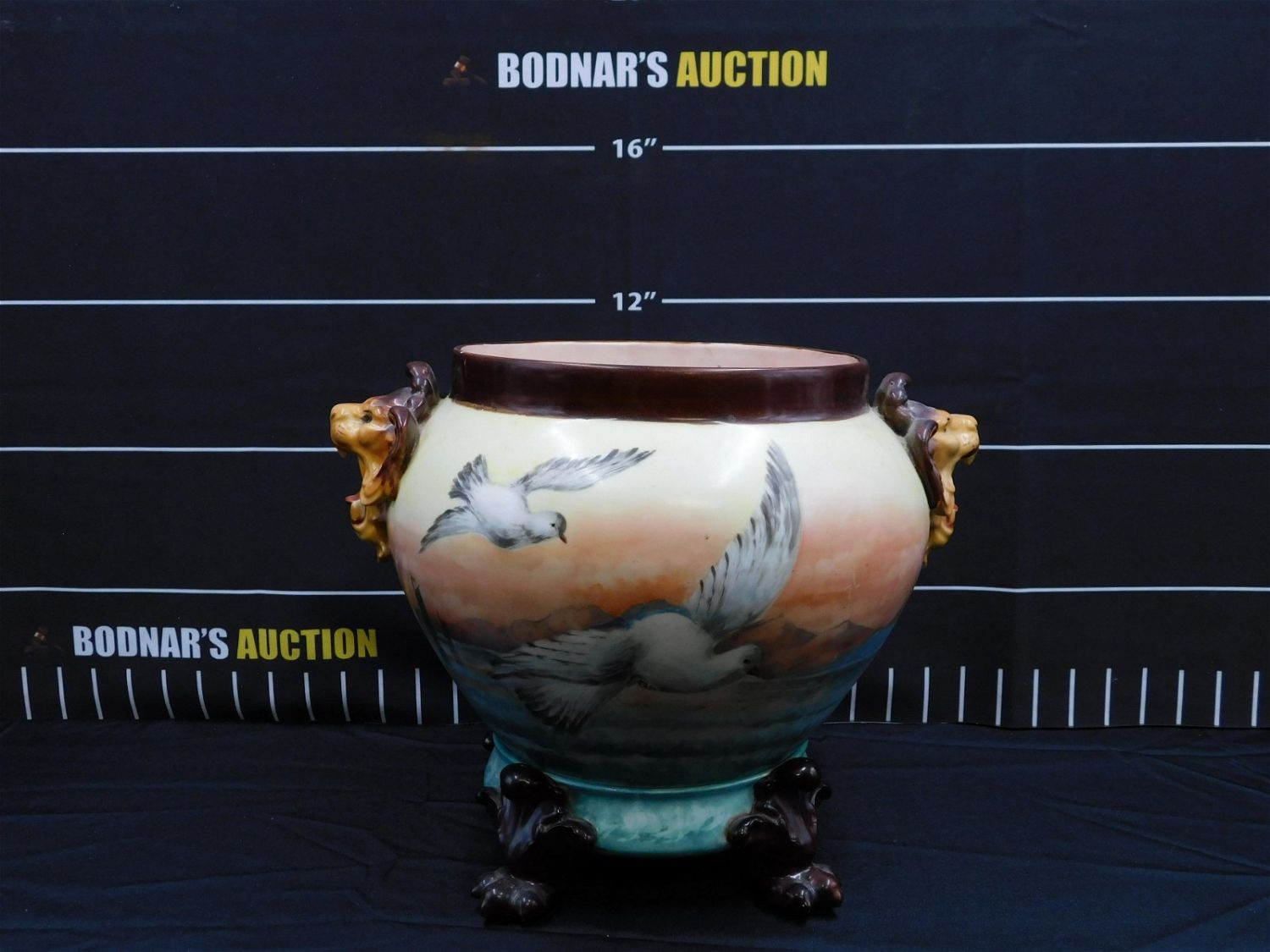 19th Century Limoges France Two Piece Pedestal with Jardinière. Depicting Birds in Flight with Ships on Ocean Scene. Has Lion Handles with Griffon Type Ears. Marked D&C France. Rim of jardinière has either been professionally repaired and showing cracking at repair or has chips. Very hard to tell. See photo. Otherwise overall very good condition. Measures 11.5" tall x 15" diameter. All invoices must be paid within 24 hours of the sale. This auction is Local Pick Up, Shipping with Liveauctioneers Live Ship, In-House Shipping on small items only, or with the Local UPS Store in Monmouth Junction, NJ. Local pickups are at our Monmouth Junction location on Friday, Saturday and Monday ONLY! All pickups are by appointment only. Any condition issues will be listed in the description. Please read the terms for full information.