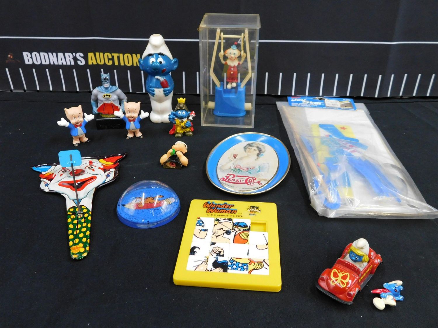 Lot of Vintage Toys including Porky Pig, Clown Noisemaker, Tin Pepsi-Cola, Wonder Woman Puzzle, and More. Please read the terms and conditions. This sale will be broadcast live on sale day with full descriptions of each lot being sold. All items MUST be paid for within 24 HOURS of the sale. Anyone who has not paid within 24 hours will have a dispute opened against them and will not be able to bid at future sales. This auction is Local Pick Up, Shipping with Liveauctioneers Live Ship, In-House Shipping on small items only, or with the Local UPS Store in Monmouth Junction, NJ. Please call them to get a quote before bidding. Their phone number is 732-230-3551. If you are picking your items up you must contact us NO LATER than 24 hours after the sale to schedule an appointment to pick up. Pick up dates are Thursday, Friday, Saturday, and Monday ONLY, and are BY APPOINTMENT ONLY!! After Monday, if you have not picked up your items, they will be disposed of.