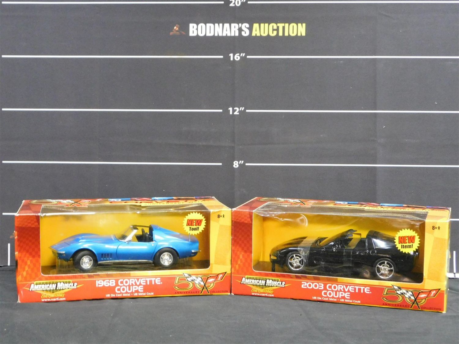Lot of 2 American Muscle 50th Anniversary Corvette Collection 1:18 Scale Diecast Cars including 1968 Corvette Coupe and 2003 Corvette Coupe. Both come in original boxes. Boxes have some wear and tear. Please read the terms and conditions. This sale will be broadcast live on sale day with full descriptions of each lot being sold. All items MUST be paid for within 24 HOURS of the sale. Anyone who has not paid within 24 hours will have a dispute opened against them and will not be able to bid at future sales. This auction is Local Pick Up, Shipping with Liveauctioneers Live Ship, In-House Shipping on small items only, or with the Local UPS Store in Monmouth Junction, NJ. Please call them to get a quote before bidding. Their phone number is 732-230-3551. If you are picking your items up you must contact us NO LATER than 24 hours after the sale to schedule an appointment to pick up. Pick up dates are Thursday, Friday, Saturday, and Monday ONLY, and are BY APPOINTMENT ONLY!! After Monday, if you have not picked up your items, they will be disposed of.