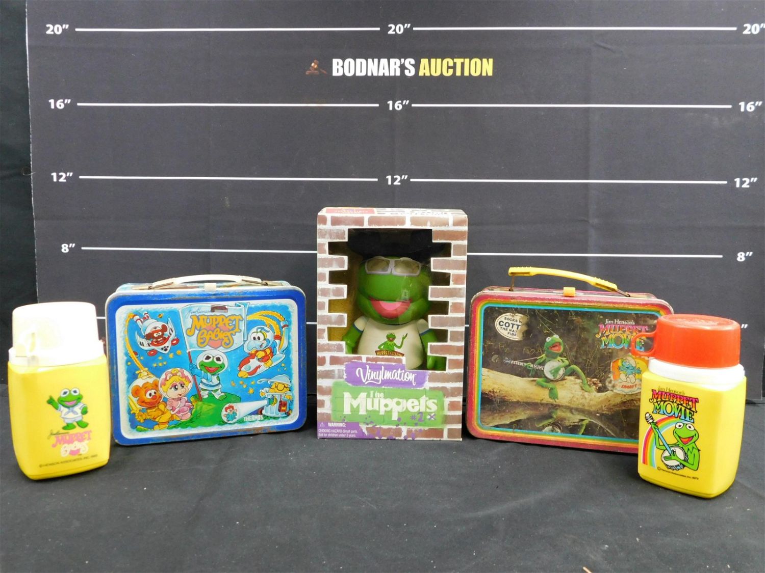 Lot of Muppets Items including The Muppets Vinylmation Kermit the Frog, Muppet Babies Tin Lunchbox with Thermos, and Muppet Movie Tin Lunchbox with Thermos. Lunchboxes have rusting and scratching. Muppet Movie has loss to paint and sticker residue. Please read the terms and conditions. This sale will be broadcast live on sale day with full descriptions of each lot being sold. All items MUST be paid for within 24 HOURS of the sale. Anyone who has not paid within 24 hours will have a dispute opened against them and will not be able to bid at future sales. This auction is Local Pick Up, Shipping with Liveauctioneers Live Ship, In-House Shipping on small items only, or with the Local UPS Store in Monmouth Junction, NJ. Please call them to get a quote before bidding. Their phone number is 732-230-3551. If you are picking your items up you must contact us NO LATER than 24 hours after the sale to schedule an appointment to pick up. Pick up dates are Thursday, Friday, Saturday, and Monday ONLY, and are BY APPOINTMENT ONLY!! After Monday, if you have not picked up your items, they will be disposed of.
