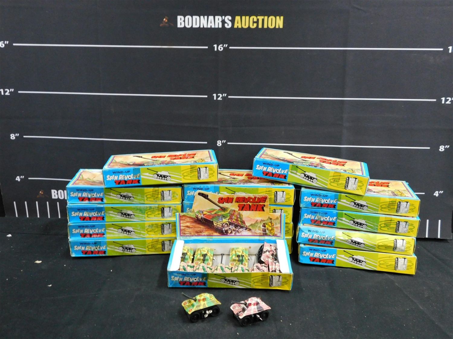 Lot of 180 Wind Up Spin Revolve Tin Tanks. Includes 15 Store Display Boxes with 12 per box. Please read the terms and conditions. This sale will be broadcast live on sale day with full descriptions of each lot being sold. All items MUST be paid for within 24 HOURS of the sale. Anyone who has not paid within 24 hours will have a dispute opened against them and will not be able to bid at future sales. This auction is Local Pick Up, Shipping with Liveauctioneers Live Ship, In-House Shipping on small items only, or with the Local UPS Store in Monmouth Junction, NJ. Please call them to get a quote before bidding. Their phone number is 732-230-3551. If you are picking your items up you must contact us NO LATER than 24 hours after the sale to schedule an appointment to pick up. Pick up dates are Thursday, Friday, Saturday, and Monday ONLY, and are BY APPOINTMENT ONLY!! After Monday, if you have not picked up your items, they will be disposed of.