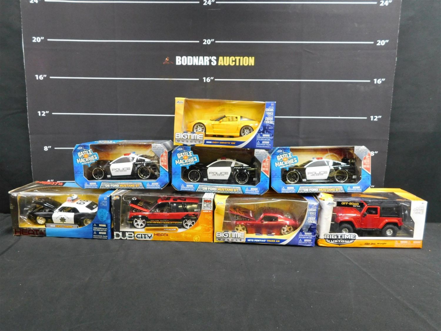 Lot of 8 Jada 1:24 Scale Diecast Cars. Including (3) Battle Machines ’06 Ford Mustang, (2) Big Time Muscle – 2006 Corvette Z06 and 1972 Pontiac Trans Am, Big Time Kustoms – 2007 Jeep Wrangler, Dub City Heat – 2002 Escalade, and Heat – 1969 Chevy Camaro. All come in boxes. Some boxes have heavier wear. Please read the terms and conditions. This sale will be broadcast live on sale day with full descriptions of each lot being sold. All items MUST be paid for within 24 HOURS of the sale. Anyone who has not paid within 24 hours will have a dispute opened against them and will not be able to bid at future sales. This auction is Local Pick Up, Shipping with Liveauctioneers Live Ship, In-House Shipping on small items only, or with the Local UPS Store in Monmouth Junction, NJ. Please call them to get a quote before bidding. Their phone number is 732-230-3551. If you are picking your items up you must contact us NO LATER than 24 hours after the sale to schedule an appointment to pick up. Pick up dates are Thursday, Friday, Saturday, and Monday ONLY, and are BY APPOINTMENT ONLY!! After Monday, if you have not picked up your items, they will be disposed of.