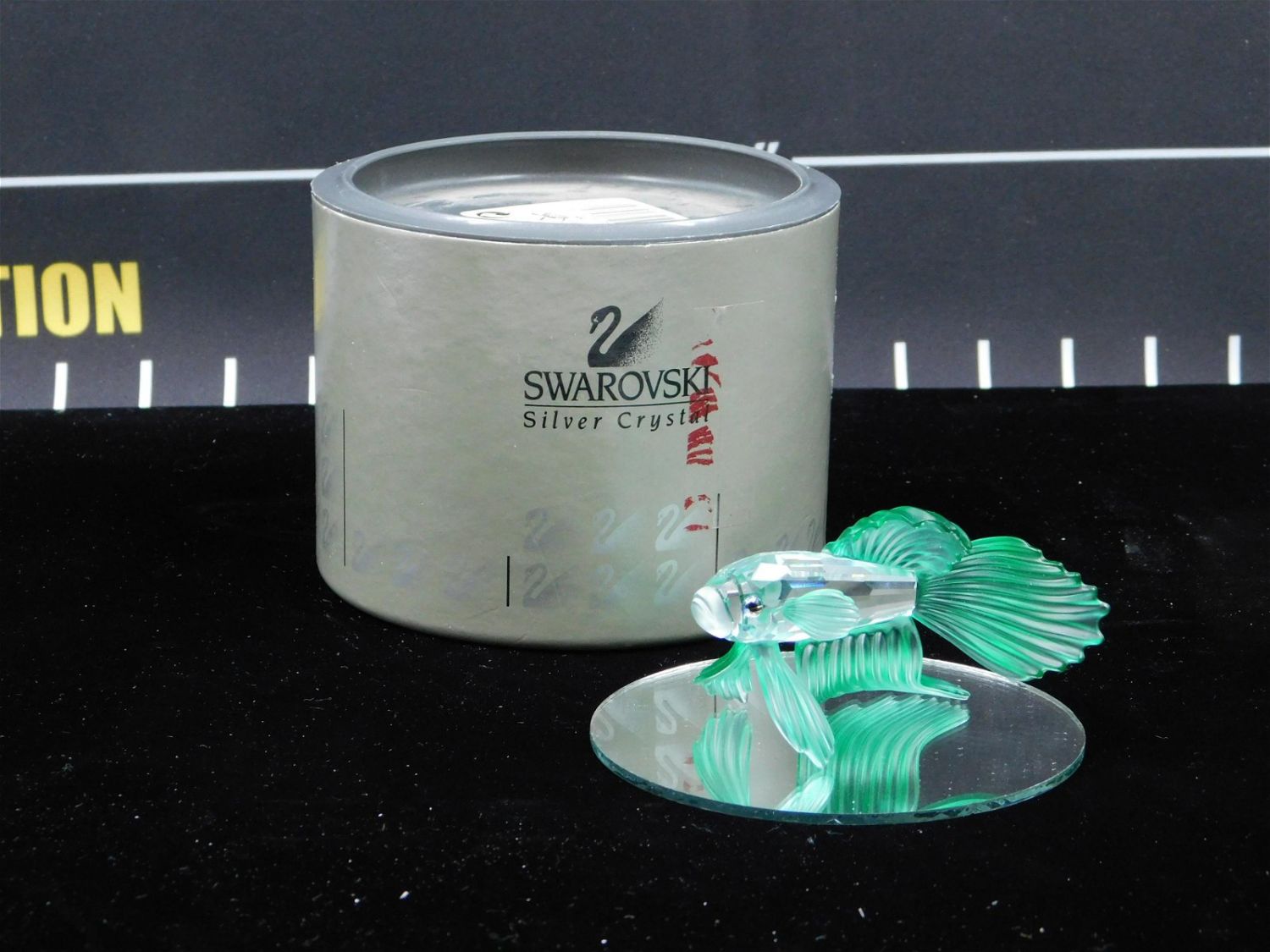 Swarovski Crystal Koi Fish Figurine with Turquoise Fins. Measures 2.5" tall x 3" wide. Comes in Box. Also comes with round glass base. All invoices must be paid within 24 hours of the sale. This auction is Local Pick Up, Shipping with Liveauctioneers Live Ship or with the Local UPS Store in Monmouth Junction, NJ. Local pickups are at our Monmouth Junction location on Friday, Saturday and Monday ONLY! All pickups are by appointment only. Any condition issues will be listed in the description. Please read the terms for full information.