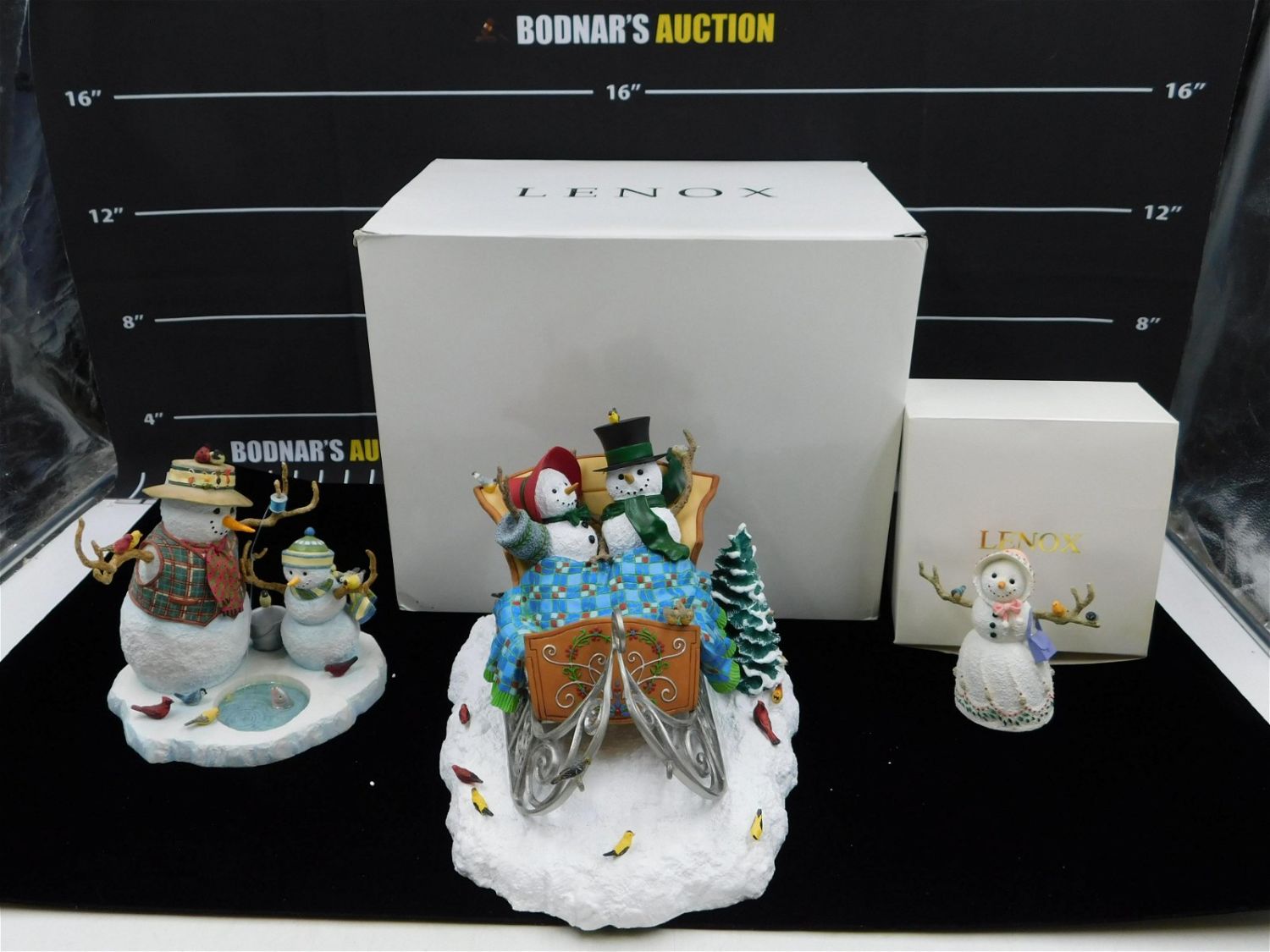 Lot of Lenox Snowmen Figurines. Includes Cozy Companion measuring 8" tall x 12" long in original box, Little Miss Snowflake measuring 4.5" tall in original box, and Fishing with Grandpa measuring 7.75" tall – Not in original box. All invoices must be paid within 24 hours of the sale. This auction is Local Pick Up, Shipping with Liveauctioneers Live Ship or with the Local UPS Store in Monmouth Junction, NJ. Local pickups are at our Monmouth Junction location on Friday, Saturday and Monday ONLY! All pickups are by appointment only. Any condition issues will be listed in the description. Please read the terms for full information.