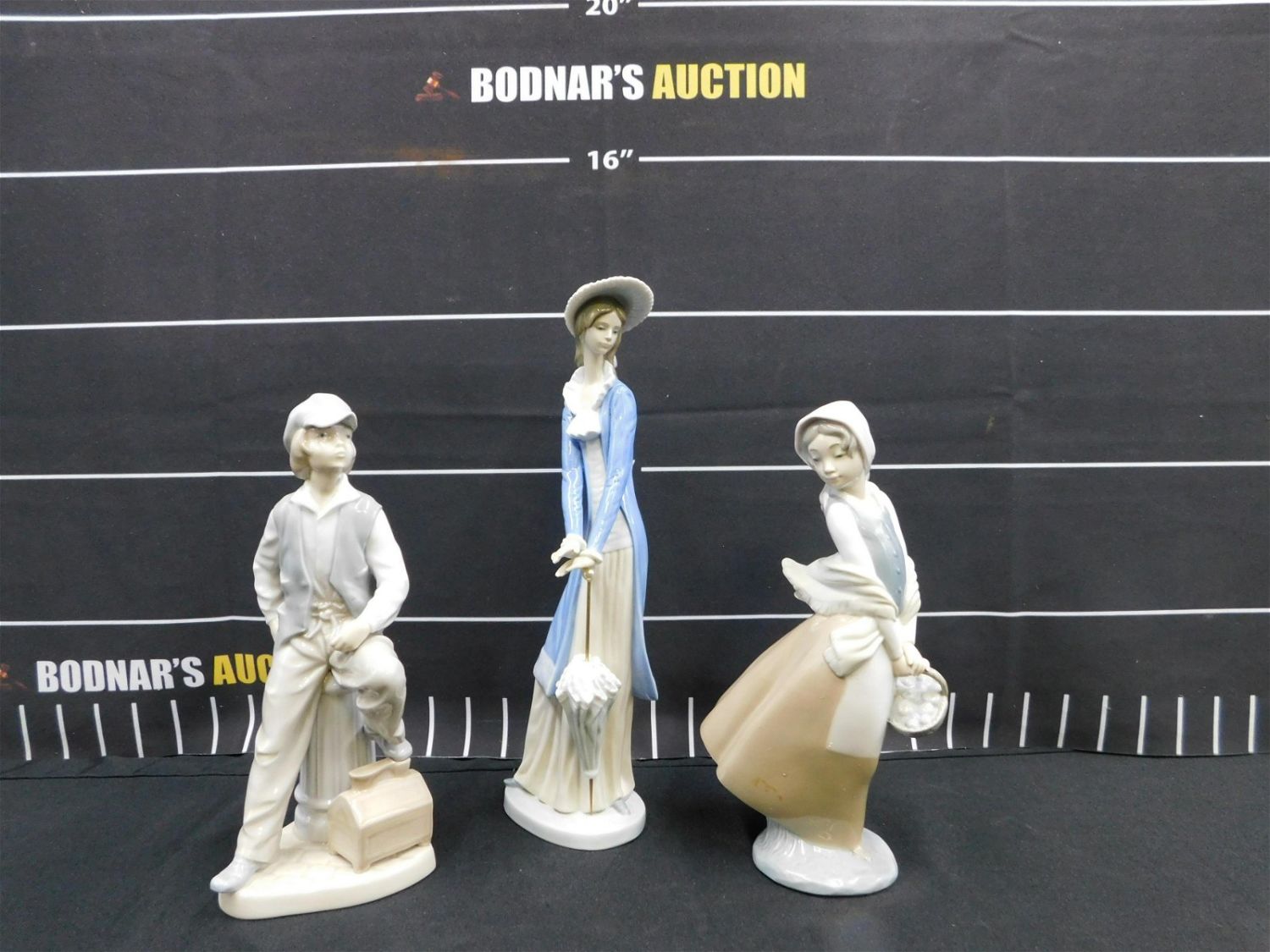 Lot of 3 Nao Figurines. Including Boy, Girl with Basket, and Woman with Umbrella. The woman with Umbrella Figurine has a rough edge on her ruffle – Not a chip – Seems to have come from manufacturing this way. Largest measures 12" tall. All invoices must be paid within 24 hours of the sale. This auction is Local Pick Up, Shipping with Liveauctioneers Live Ship or with the Local UPS Store in Monmouth Junction, NJ. Local pickups are at our Monmouth Junction location on Friday, Saturday and Monday ONLY! All pickups are by appointment only. Any condition issues will be listed in the description. Please read the terms for full information.