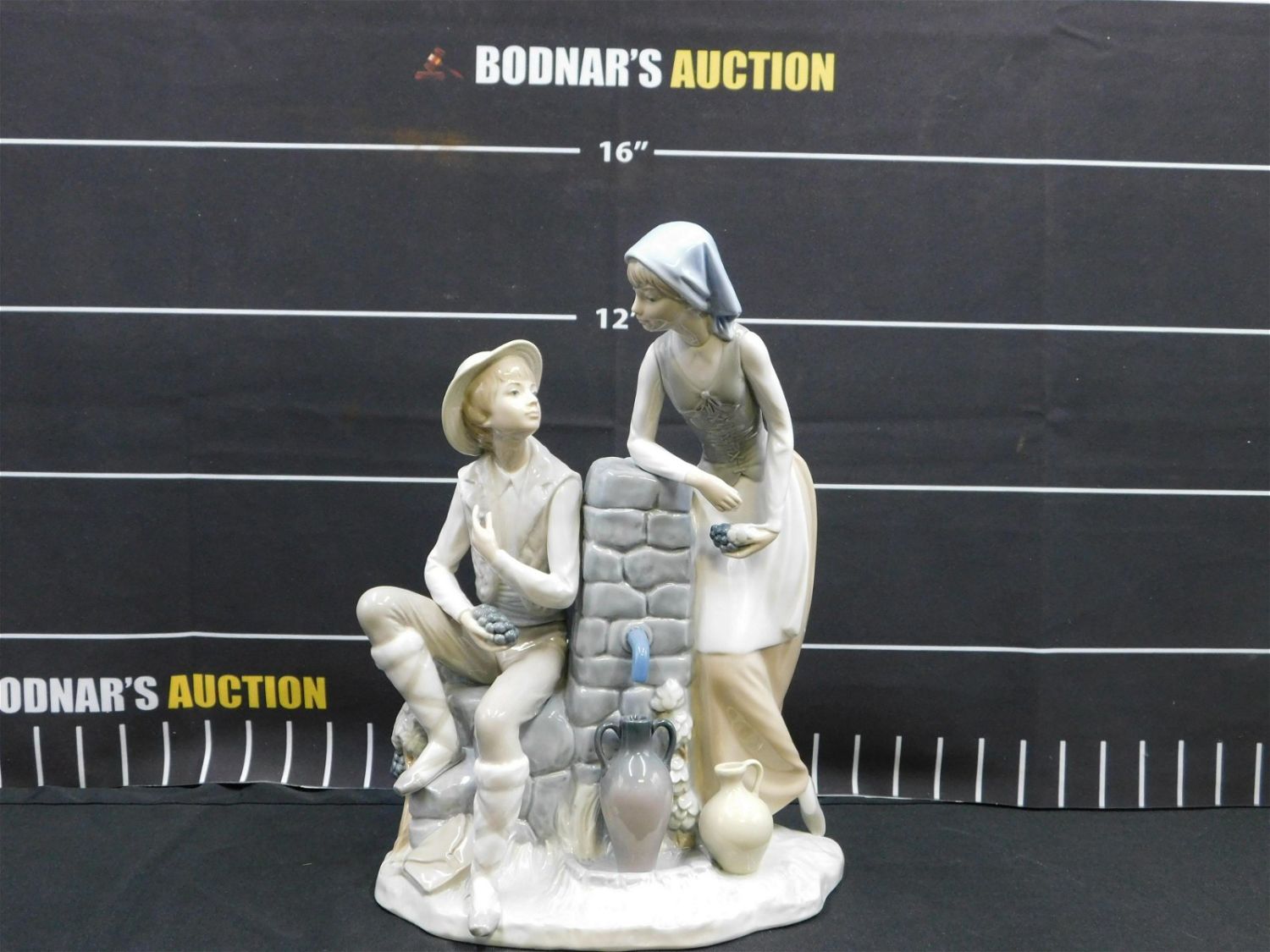 NAO Figurine. Depicts Boy and Girl with Grapes. Measures 13.25" tall x 10" wide. All invoices must be paid within 24 hours of the sale. This auction is Local Pick Up, Shipping with Liveauctioneers Live Ship or with the Local UPS Store in Monmouth Junction, NJ. Local pickups are at our Monmouth Junction location on Friday, Saturday and Monday ONLY! All pickups are by appointment only. Any condition issues will be listed in the description. Please read the terms for full information.