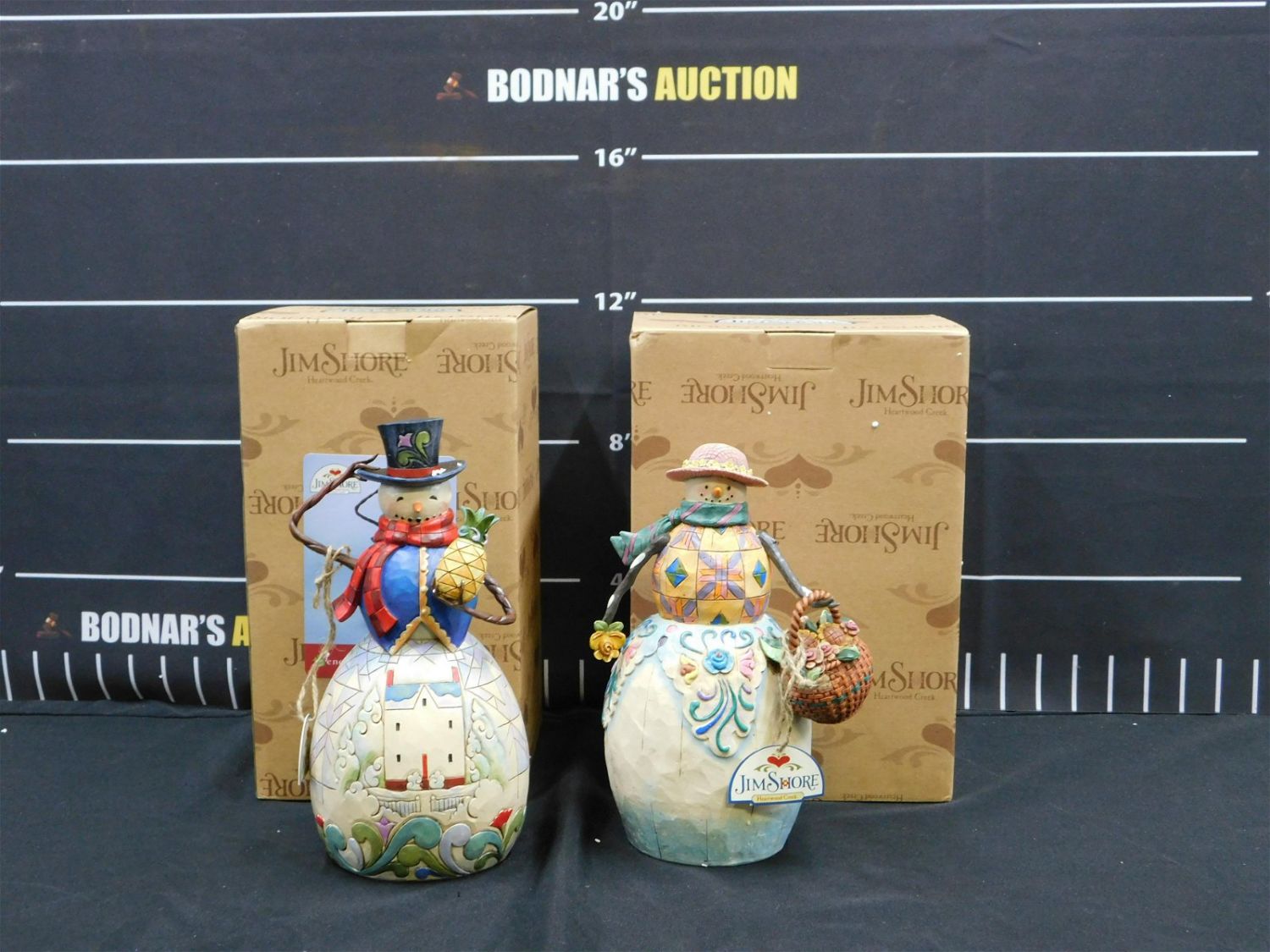 Lot of 2 Jim Shore Snowmen Figurines including "Winter’s Promise" – Snowman/Flower Basket and "Welcome Winter’s Wonders" – Snowman/Pineapple/Town Scene. Both come in Original Boxes. Largest Measures 10" tall. Figures are in New Condition – Removed from box for picture purposes only. All invoices must be paid within 24 hours of the sale. This auction is Local Pick Up, Shipping with Liveauctioneers Live Ship or with the Local UPS Store in Monmouth Junction, NJ. Local pickups are at our Monmouth Junction location on Friday, Saturday and Monday ONLY! All pickups are by appointment only. Any condition issues will be listed in the description. Please read the terms for full information.