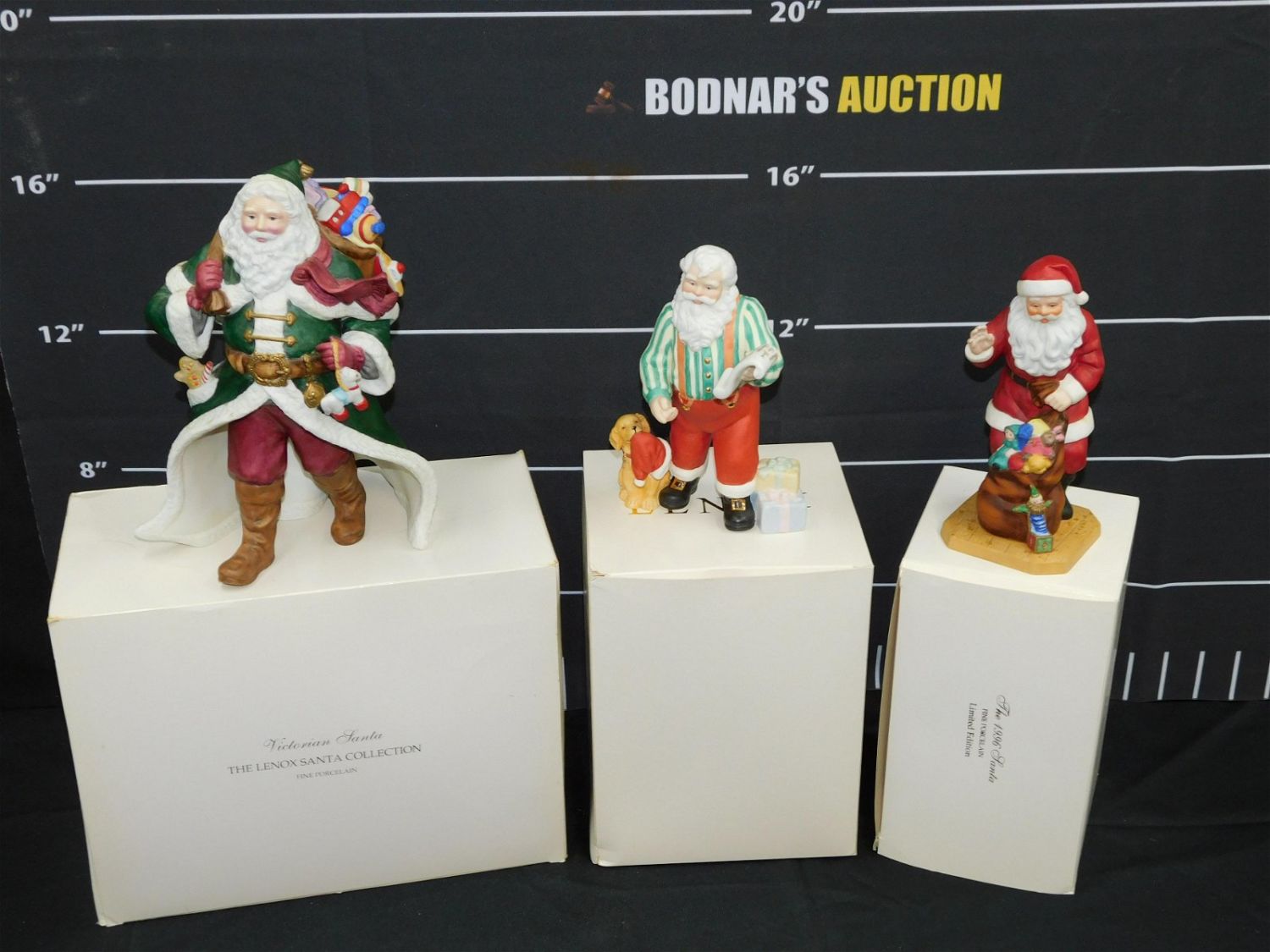 Lot of 3 Lenox Santa Claus Figurines from The Santa Collection including Victorian Santa, 1996 Santa and Santa’s Plan 2004 – Missing Globe. All have boxes. All need to be cleaned. Largest measures 9.5" x 6.5" wide. All invoices must be paid within 24 hours of the sale. This auction is Local Pick Up, Shipping with Liveauctioneers Live Ship or with the Local UPS Store in Monmouth Junction, NJ. Local pickups are at our Monmouth Junction location on Friday, Saturday and Monday ONLY! All pickups are by appointment only. Any condition issues will be listed in the description. Please read the terms for full information.