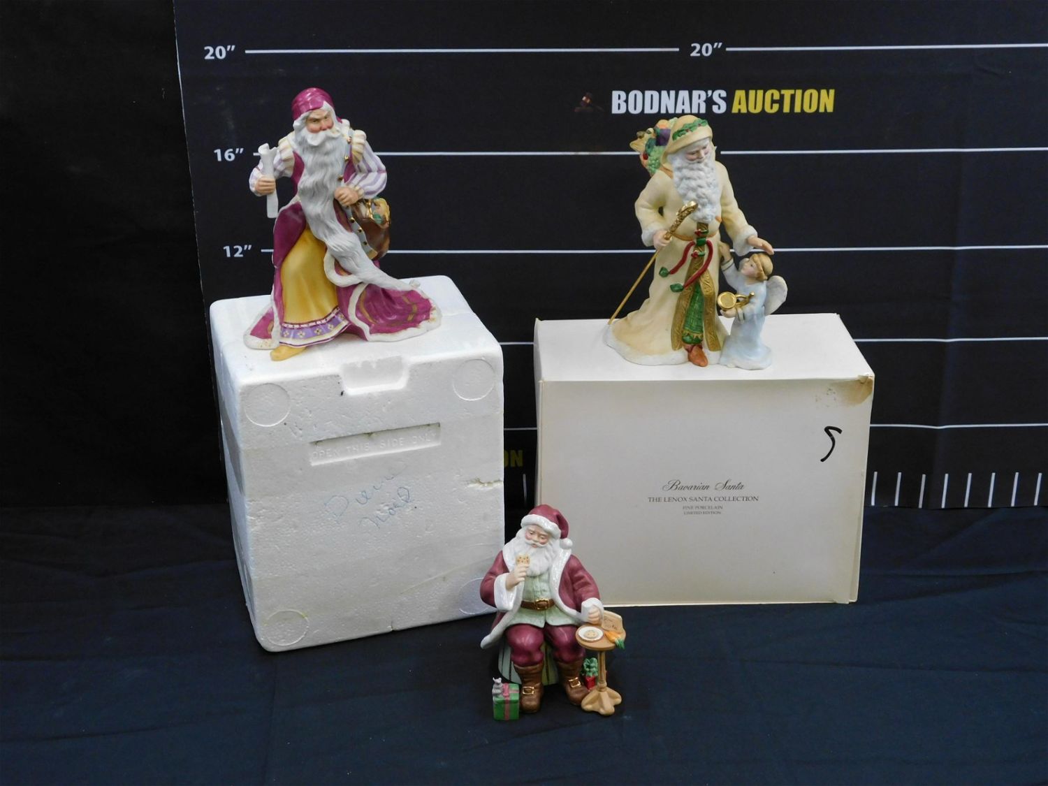 Lot of 3 Lenox Santa Claus Figurines from The Santa Collection including 1993 Bavarian Santa – With Box, 1992 Pere Noel – Styrofoam Insert – Missing Outer Box, and Cookies for Santa – No Box. All need to be cleaned. Largest measures 9.5" x 7" wide. All invoices must be paid within 24 hours of the sale. This auction is Local Pick Up, Shipping with Liveauctioneers Live Ship or with the Local UPS Store in Monmouth Junction, NJ. Local pickups are at our Monmouth Junction location on Friday, Saturday and Monday ONLY! All pickups are by appointment only. Any condition issues will be listed in the description. Please read the terms for full information.