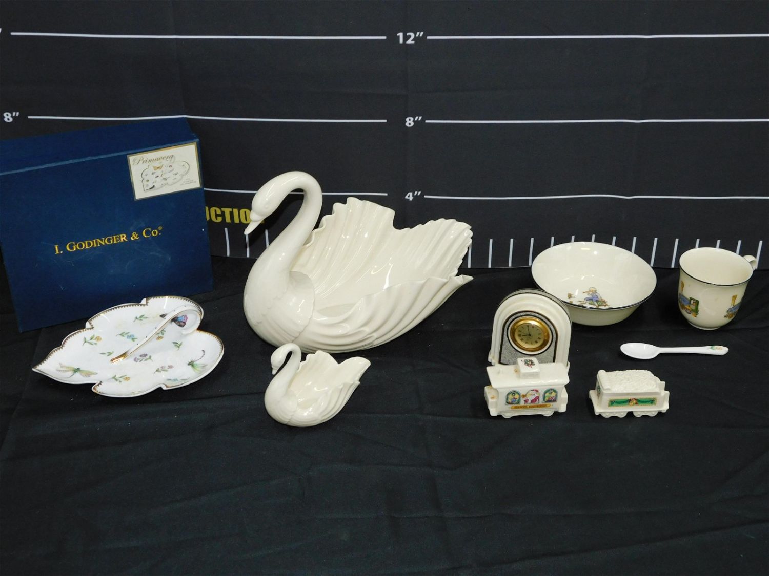 Lot of Mostly Lenox Porcelain Pieces including 2 Lenox Swans, Lenox Clock, 2 Lenox Caboose and Coal Tender, Lenox Cereal Set, and I Godinger and Co. Leaf Dish with Box. All need to be cleaned. Largest measures 8.5" tall x 11" wide. All invoices must be paid within 24 hours of the sale. This auction is Local Pick Up, Shipping with Liveauctioneers Live Ship or with the Local UPS Store in Monmouth Junction, NJ. Local pickups are at our Monmouth Junction location on Friday, Saturday and Monday ONLY! All pickups are by appointment only. Any condition issues will be listed in the description. Please read the terms for full information.