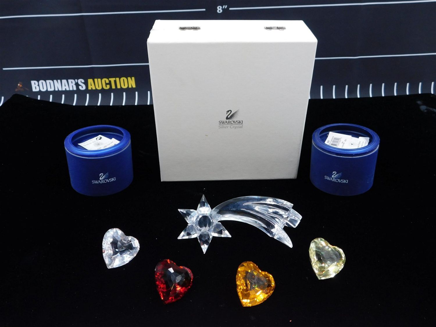 Lot of 5 Pieces of Swarovski Crystal including (4) Heart Figures – Topaz in Box, 2004 Yellow Event in Box, Red – No Box, and Clear – No Box. Also included is Crystal Comet Candle Holder in Box. Hearts measure 1.5". The comet measures approx. 5.5". All invoices must be paid within 24 hours of the sale. This auction is Local Pick Up, Shipping with Liveauctioneers Live Ship or with the Local UPS Store in Monmouth Junction, NJ. Local pickups are at our Monmouth Junction location on Friday, Saturday and Monday ONLY! All pickups are by appointment only. Any condition issues will be listed in the description. Please read the terms for full information.