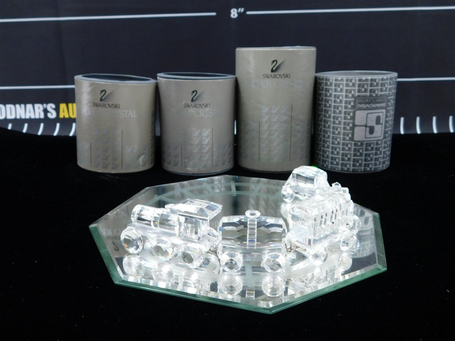 Swarovski Crystal Miniature Train Set including 5 Figurines including Locomotive – Broken – Missing Smokestack, and 4 Train Cars with Mirrored Train Base. 4 Come in Original Boxes. Locomotive measures approx. 2.5" long. All invoices must be paid within 24 hours of the sale. This auction is Local Pick Up, Shipping with Liveauctioneers Live Ship or with the Local UPS Store in Monmouth Junction, NJ. Local pickups are at our Monmouth Junction location on Friday, Saturday and Monday ONLY! All pickups are by appointment only. Any condition issues will be listed in the description. Please read the terms for full information.