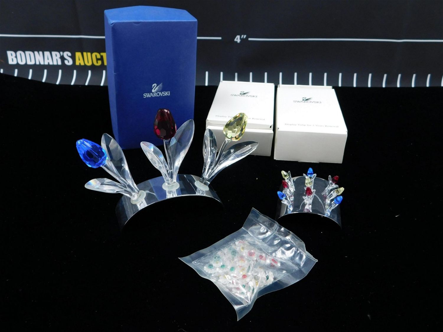 Lot of Swarovski Flower Crystal Figurines including Renewal Tulips with Base, Small Arrangement of Miniature Tulips, and bag with extra crystal flowers. Large Tulips measure 3.5" long. Small tulips measure 1.5". All invoices must be paid within 24 hours of the sale. This auction is Local Pick Up, Shipping with Liveauctioneers Live Ship or with the Local UPS Store in Monmouth Junction, NJ. Local pickups are at our Monmouth Junction location on Friday, Saturday and Monday ONLY! All pickups are by appointment only. Any condition issues will be listed in the description. Please read the terms for full information.