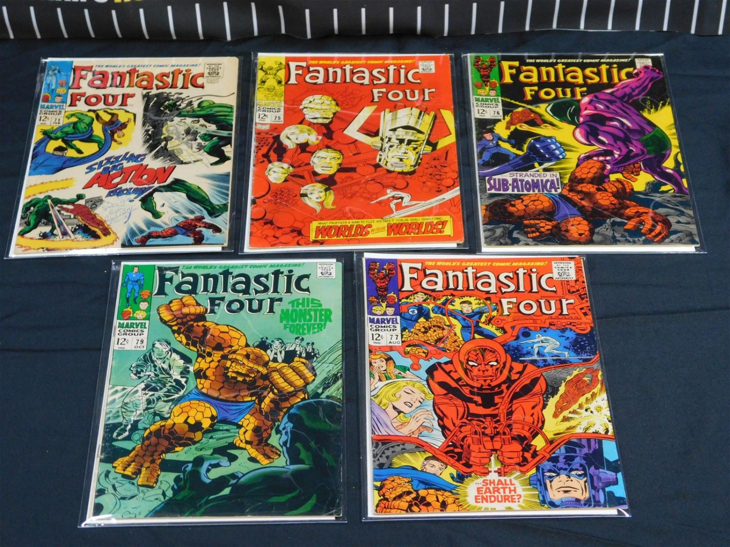 Lot of 5 Silver Age Fantastic Four Comics including Issues #71, 75, 76, 77, and 79. Issue #71 has writing in pen on the cover. Issue #75 has a tape kiss on the front cover and also has circular beverage marks on the front cover. Please read the terms and conditions. This sale will be broadcast live on sale day with full descriptions of each lot being sold. All items MUST be paid for within 24 HOURS of the sale. Anyone who has not paid within 24 hours will have a dispute opened against them and will not be able to bid at future sales. If you need your items shipped, we will send your items to the UPS store in Monmouth Junction, NJ . They will pack it and ship it to you and you will pay them separately and directly. Please call them to get a quote before bidding. Their phone number is 732-230-3551. If you are picking your items up you must contact us NO LATER than 24 hours after the sale to schedule an appointment to pick up. Pick up dates are Thursday, Friday, Saturday, and Monday ONLY, and are BY APPOINTMENT ONLY!! After Monday, if you have not picked up your items, they will be disposed of.