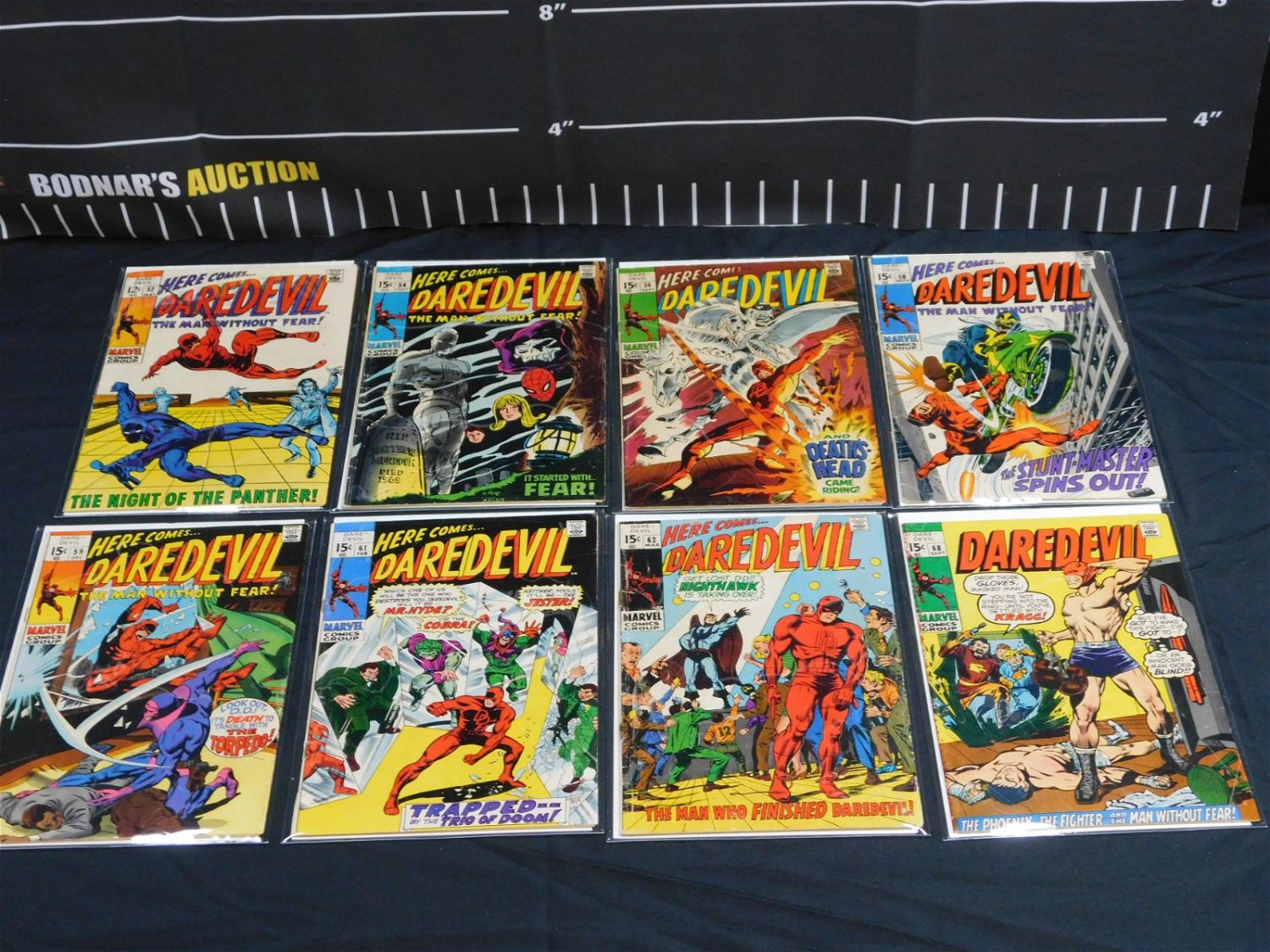 Lot of 8 Silver Age Daredevil Comics including #52, 54, 56, 58, 59, 61, 62, and 68. Please read the terms and conditions. This sale will be broadcast live on sale day with full descriptions of each lot being sold. All items MUST be paid for within 24 HOURS of the sale. Anyone who has not paid within 24 hours will have a dispute opened against them and will not be able to bid at future sales. If you need your items shipped, we will send your items to the UPS store in Monmouth Junction, NJ . They will pack it and ship it to you and you will pay them separately and directly. Please call them to get a quote before bidding. Their phone number is 732-230-3551. If you are picking your items up you must contact us NO LATER than 24 hours after the sale to schedule an appointment to pick up. Pick up dates are Thursday, Friday, Saturday, and Monday ONLY, and are BY APPOINTMENT ONLY!! After Monday, if you have not picked up your items, they will be disposed of.
